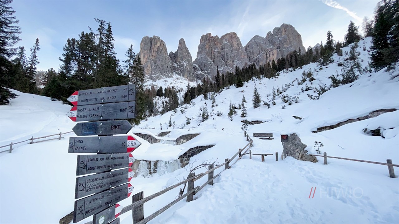 Schließlich zweigt am rechten Wegesrand der Weg Nr. 36A zur nunmehr recht nahen Geisleralm ab. Wenig später lädt die beliebte Almhütte vor der majestätischen Felskulisse der Geislerspitzen inmitten schneebedeckter Almwiesen zur genüsslichen Einkehr.
