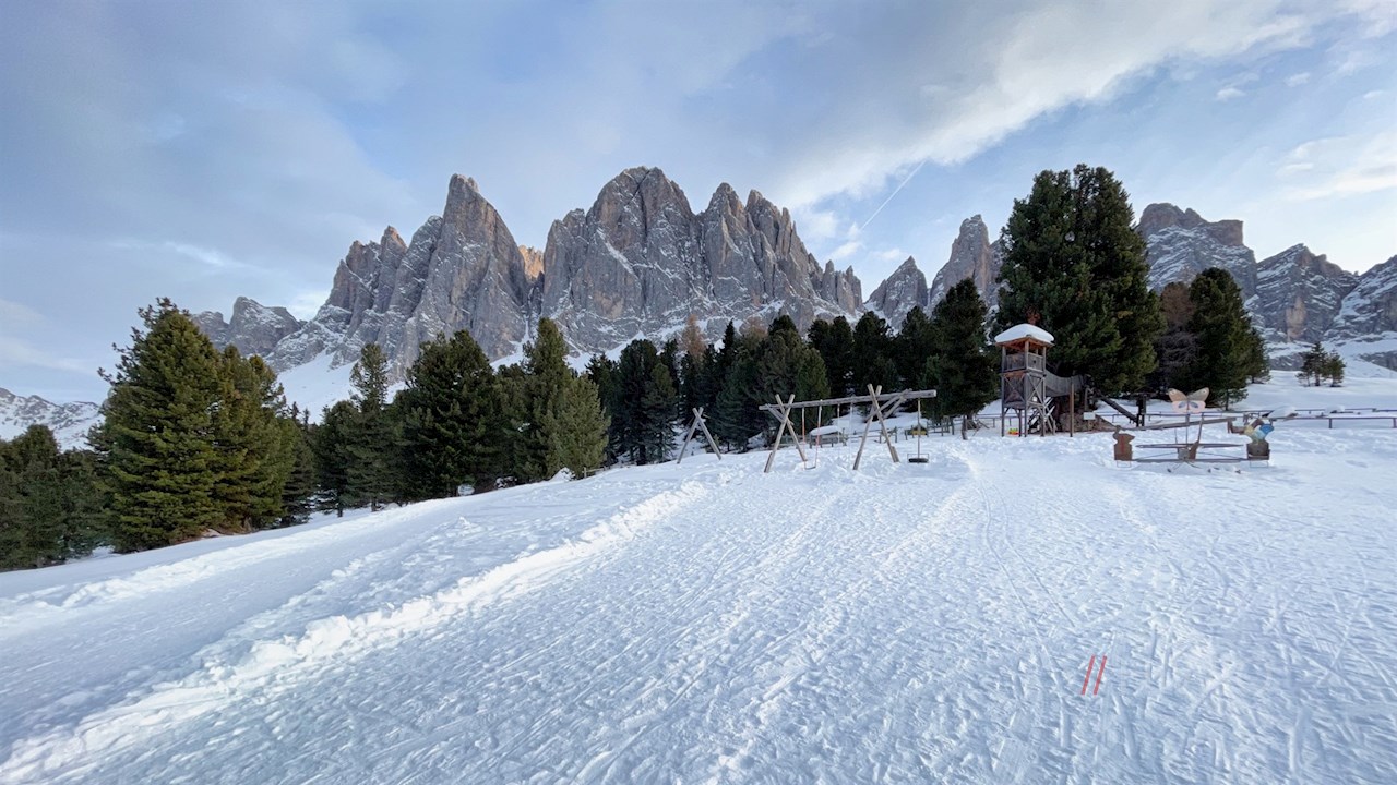 Er führt im sanften Auf und Ab durch die schneefunkelnde Winterlandschaft und öffnet dabei atemberaubende Nahblicke auf die schneeverhangenen Geislerspitzen.