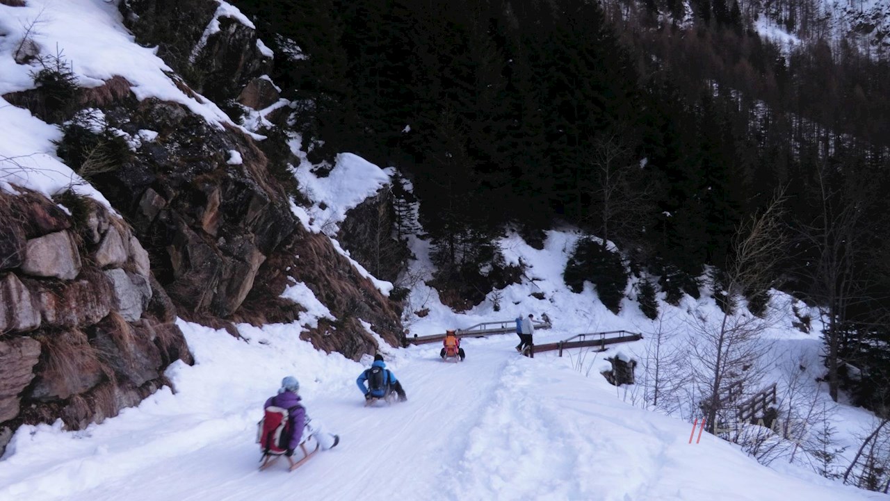 Der Rückweg erfolgt auf dem Hinweg. Er kann zu Fuß oder mit der Rodel angetreten werden.