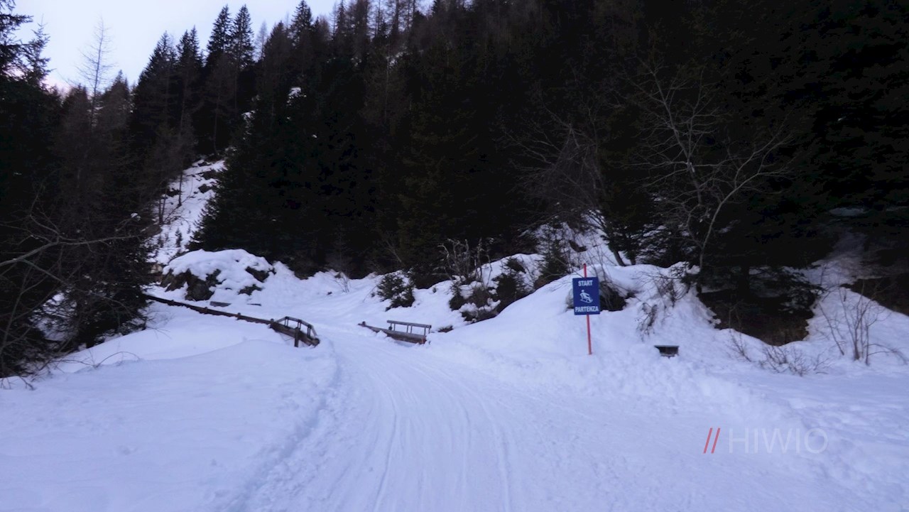 Dem Wegweiser in Richtung Fane Alm folgend, führt der breite, zunächst gemächlich ansteigende Forstweg an der Kurzkofelhütte vorbei durch den winterlich verschneiten Wald. Ständiger Wegbegleiter ist der z. T. unter einer Schnee- und Eisdecke verborgene Valler Bach.
