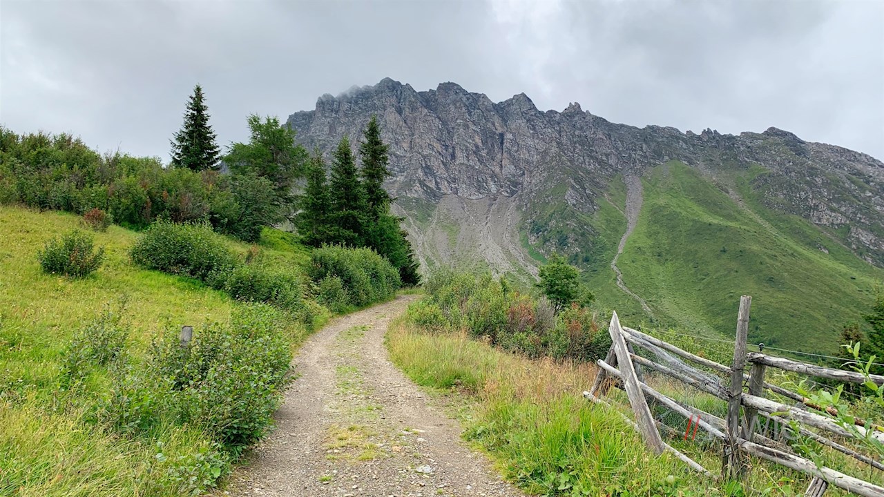 Von der Enzianhütte schlängelt sich der breite Wanderweg Nr. 4A durch aussichtsreiche, von der Kalkwandstange und der Daxspitze umrahmte Weidewiesen auf das Schlüsseljoch.