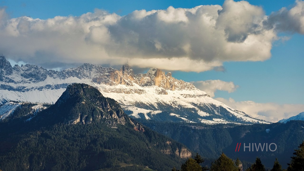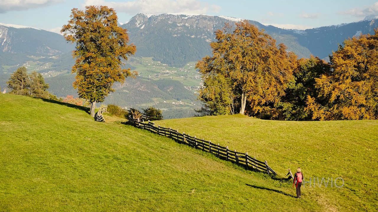 An der nächsten Weggabelung lohnt ein Abstecher zum Aussichtspunkt Waldnereck. Hier entfaltet sich ein atemberaubend schöner Ausblick auf den Schlern, die Hammerwand, den Tschafon, den Rosengarten, den Latemar und die darunter liegenden Eisacktaler Dörfer. Die kleine Rastbank unter der alten Lärche lädt zum Innehalten und Verweilen ein.