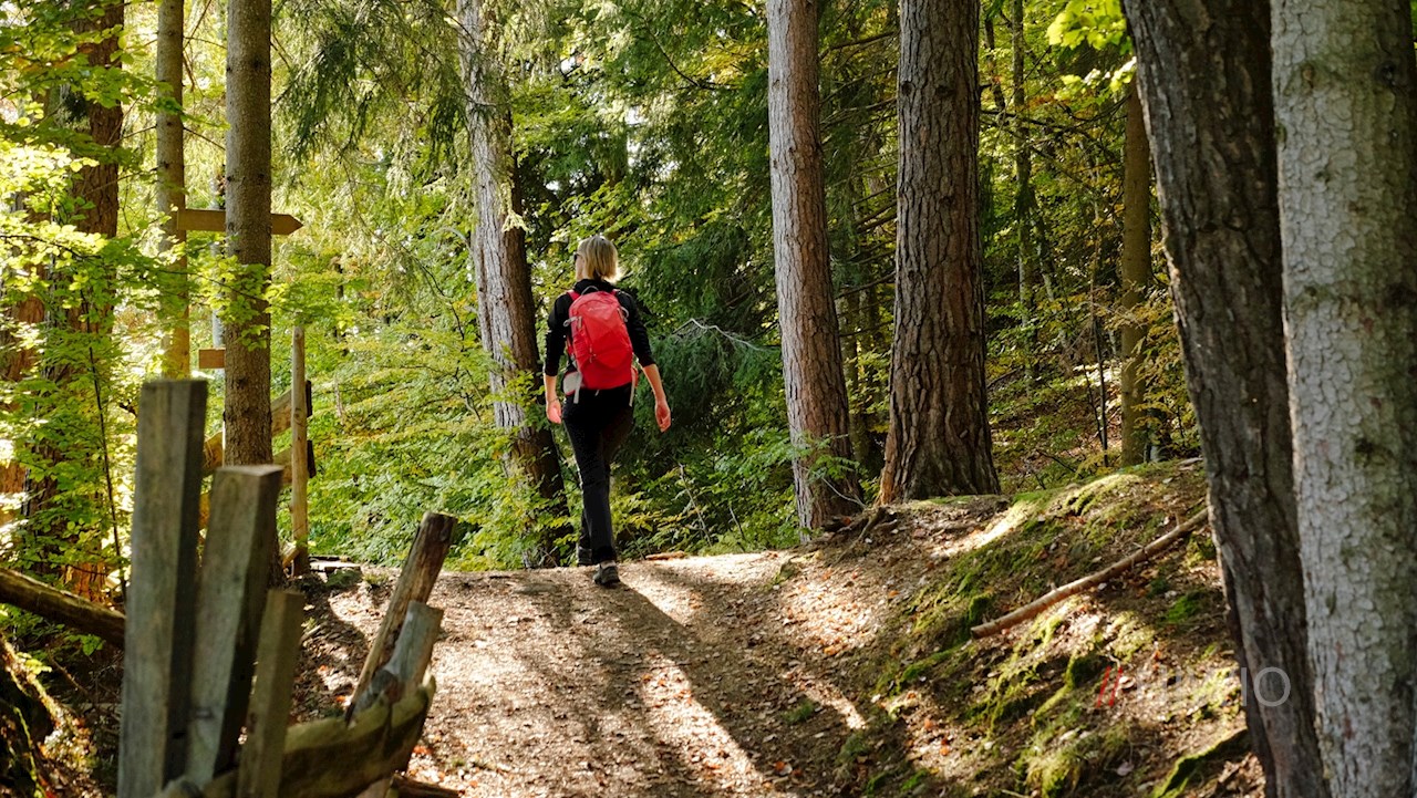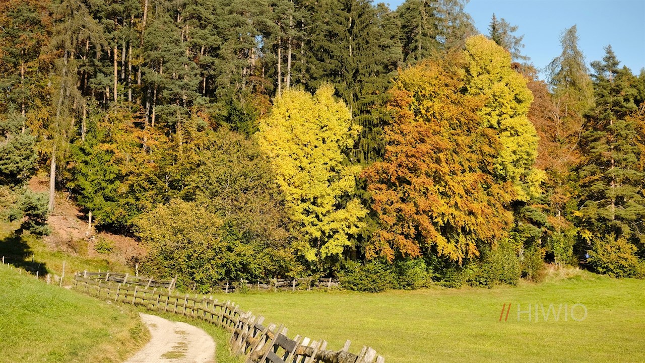 Stets der Wegnummer 15 in Richtung Wolfsgruben folgend, führt der Wanderweg von der Sportzone teils eben, teils im leichten Auf und Ab durch Wald und Wiesen, die sich im Herbst in ein leuchtendes Farbenmeer verwandeln.