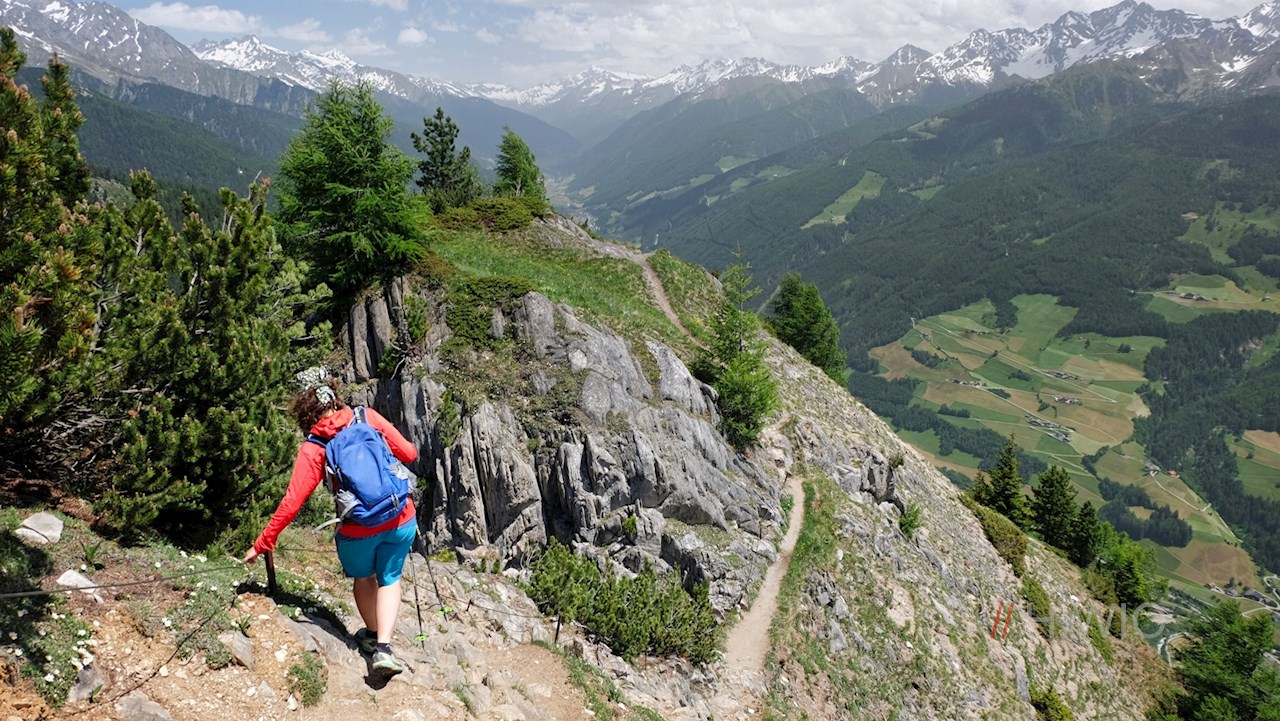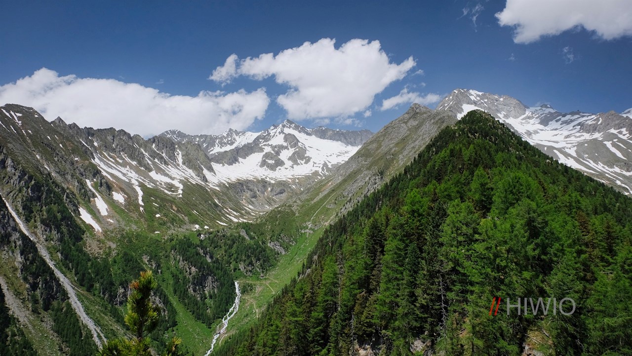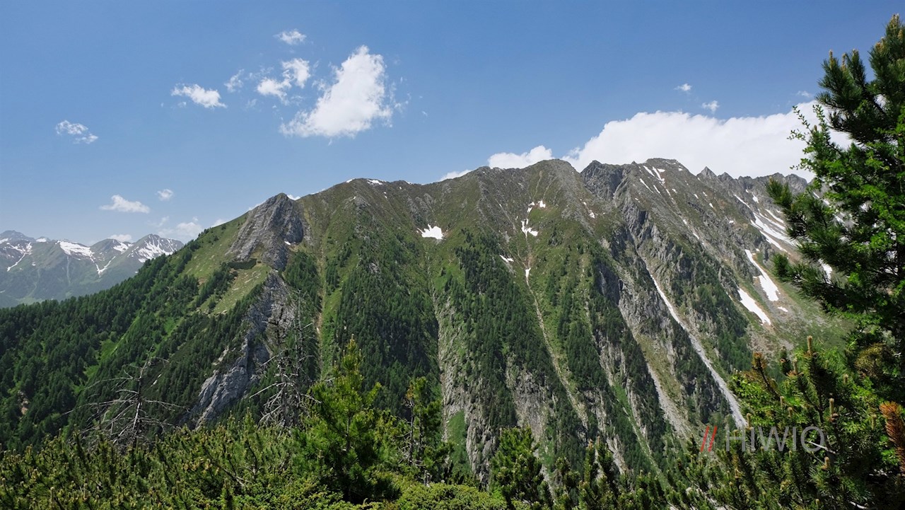 Auf dem aus hellem Dolomitgestein aufgebauten, 2.050 m hohen Gipfel des Wolfskofel öffnet sich schließlich ein unerwartet weitreichender Ausblick: Der Blick schweift von der hinter uns aufsteigenden Gletscherwelt um den Schwarzenstein über die imposante, im hintersten Ahrntal aufstrebende Dreiherrenspitze zur vor uns aufragenden Gipfelwelt mit dem Moosstock, der Großen Windschar oder dem Blossberg. Neben uns erhebt sich indes der nahe, ebenfalls von einer dolomitweißen Bergspitze gekrönte Schönberg. Eine Aussichtsbank lädt zum Verweilen und Genießen dieser traumverlorenen Idylle ein.