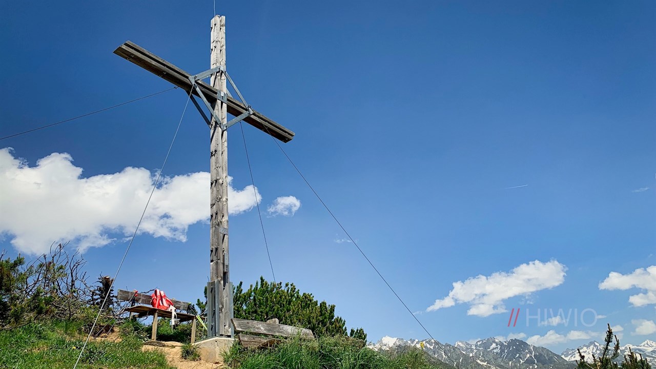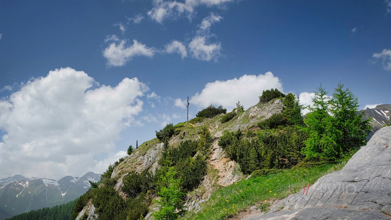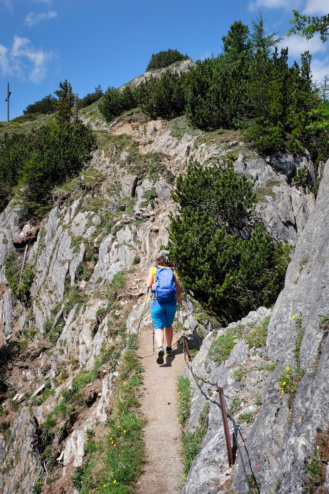 Nach rund 700 bewältigten Höhenmetern erblickt man das elegante Gipfelkreuz des bewaldeten Wolfskofel. Nun folgt der letzte Anstieg über eine leicht ausgesetzte Felspassage, die dank der angebrachten Halteseile für einigermaßen geübte Wanderer recht einfach zu meistern sein dürfte.