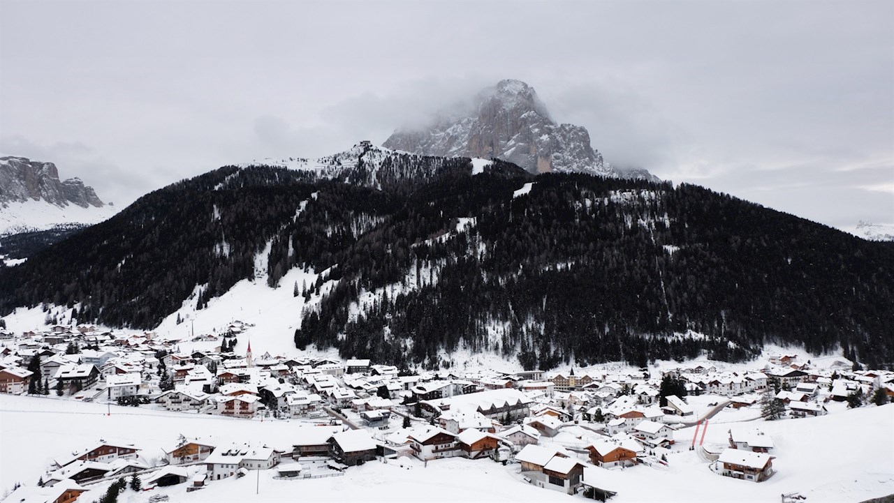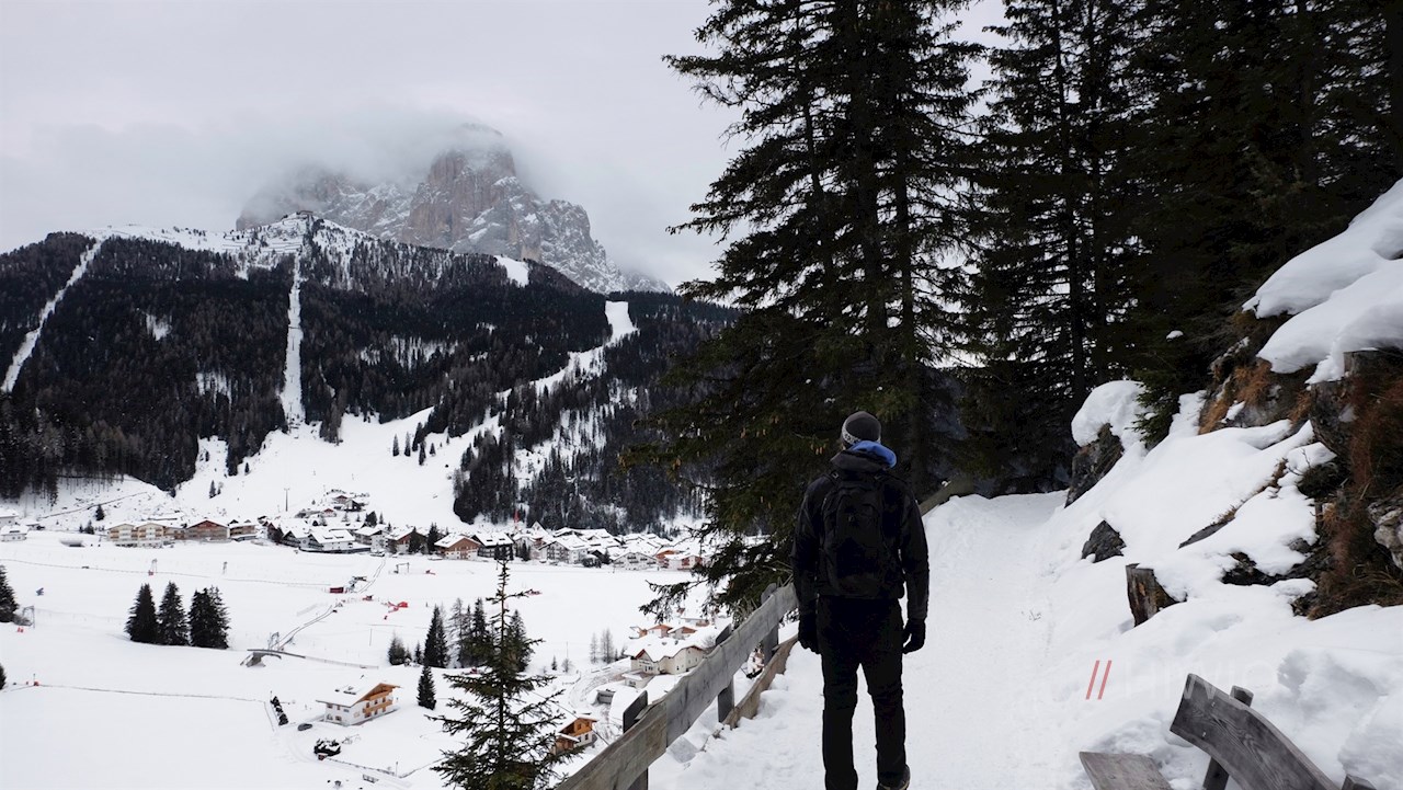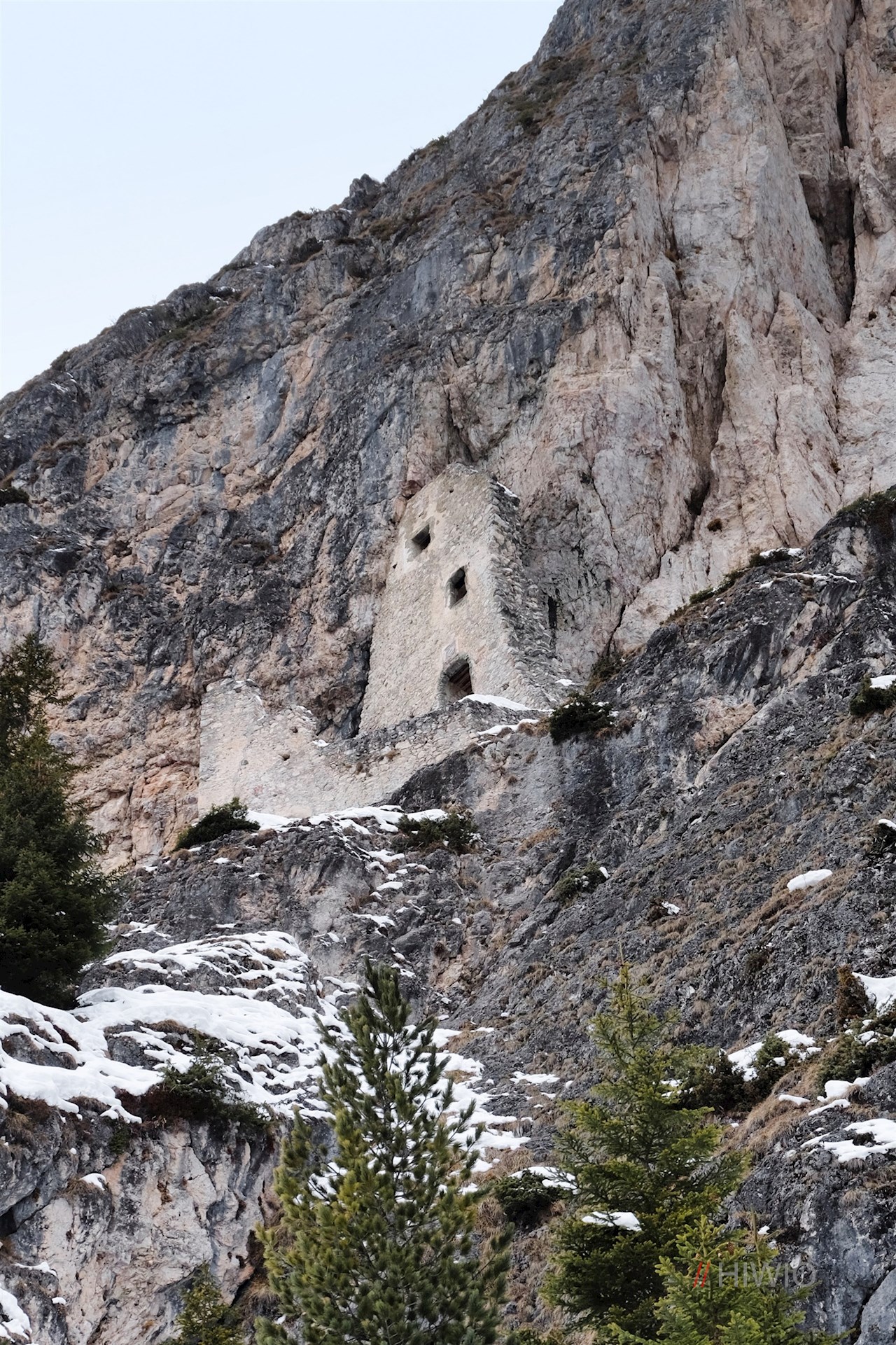 Sie führt durch die lichten Waldstücke am Fuße der wuchtigen Steviawände und öffnet dabei schöne Ausblicke auf den schneebedeckten Sellastock, den Langkofel und das idyllische Dolomitendorf Wolkenstein. Wer genau hinsieht, entdeckt über sich die eng an die Felswände geschmiegte, nunmehr dem Verfall preisgegebene Stammburg der Tiroler Adelsfamilie Wolkenstein-Trostburg. Auch ihr bekanntester Spross, der weitgereiste Minnesänger, Diplomat und königliche Berater Oswald von Wolkenstein, soll hier oben so manchen Sommer zugebracht haben.
