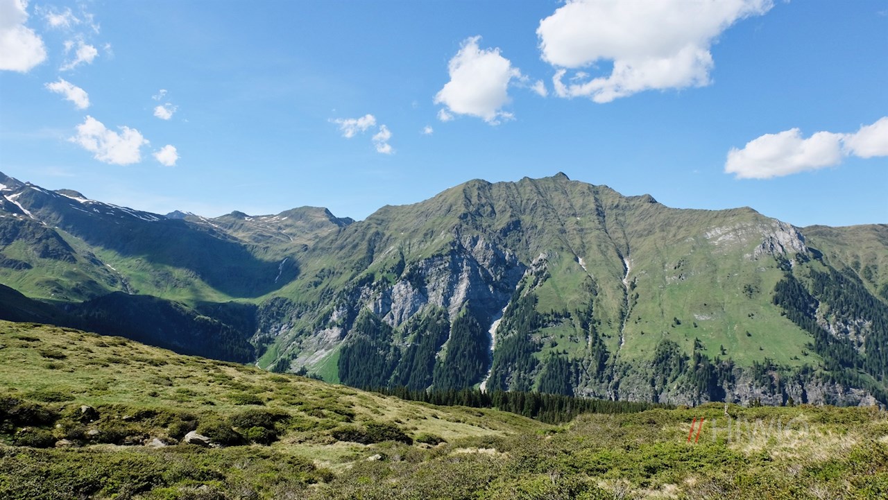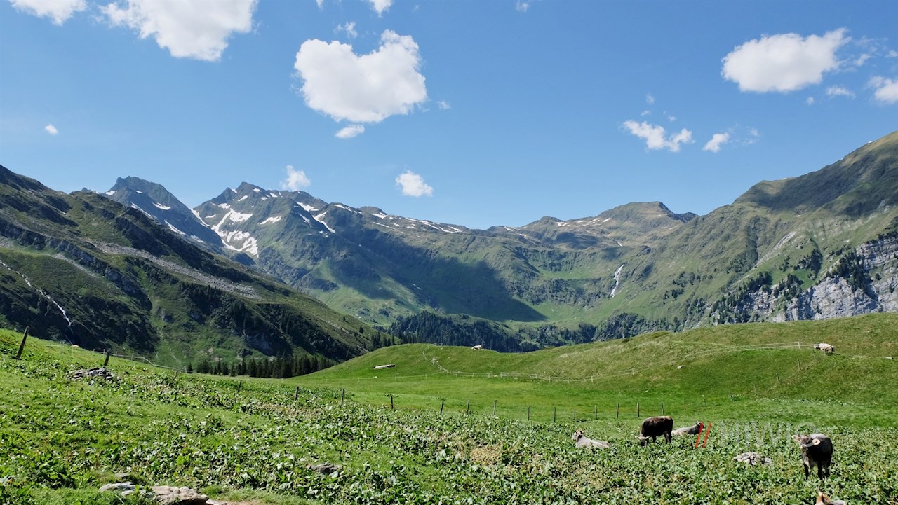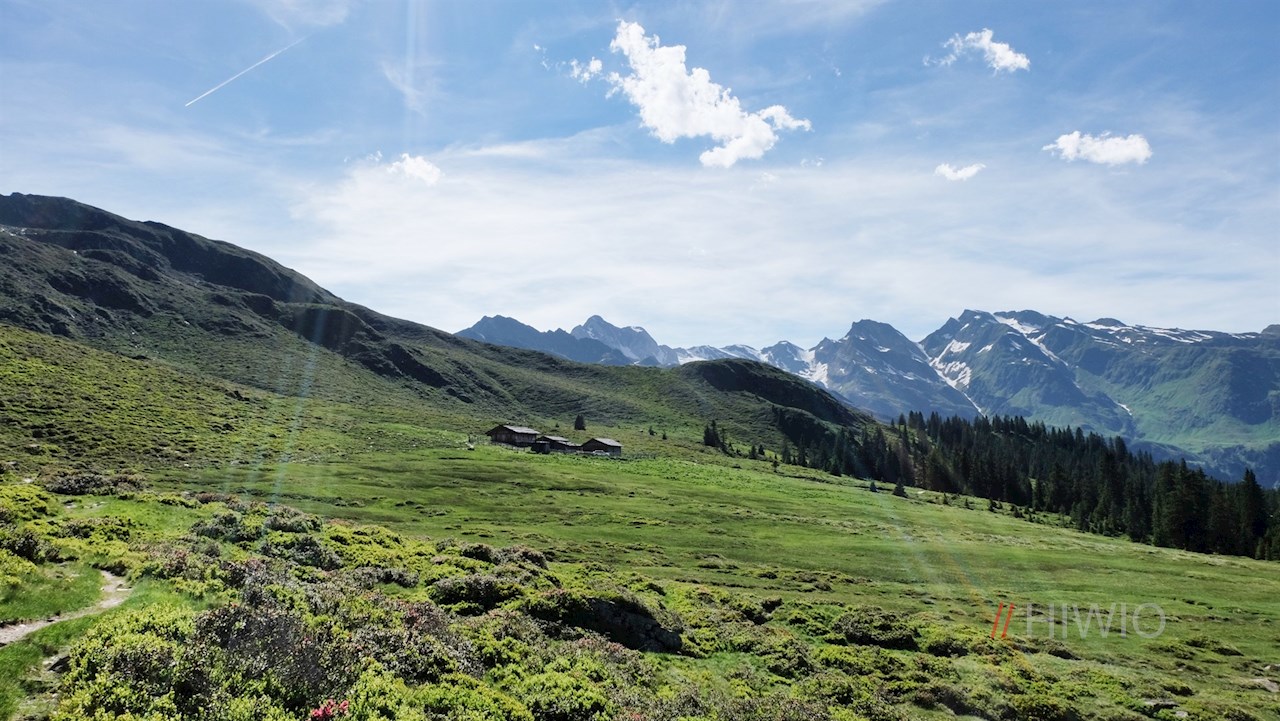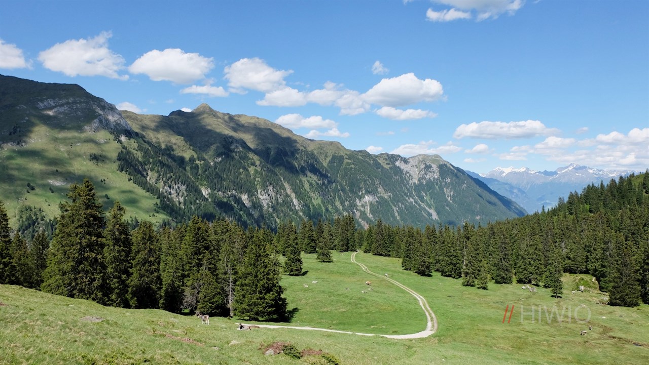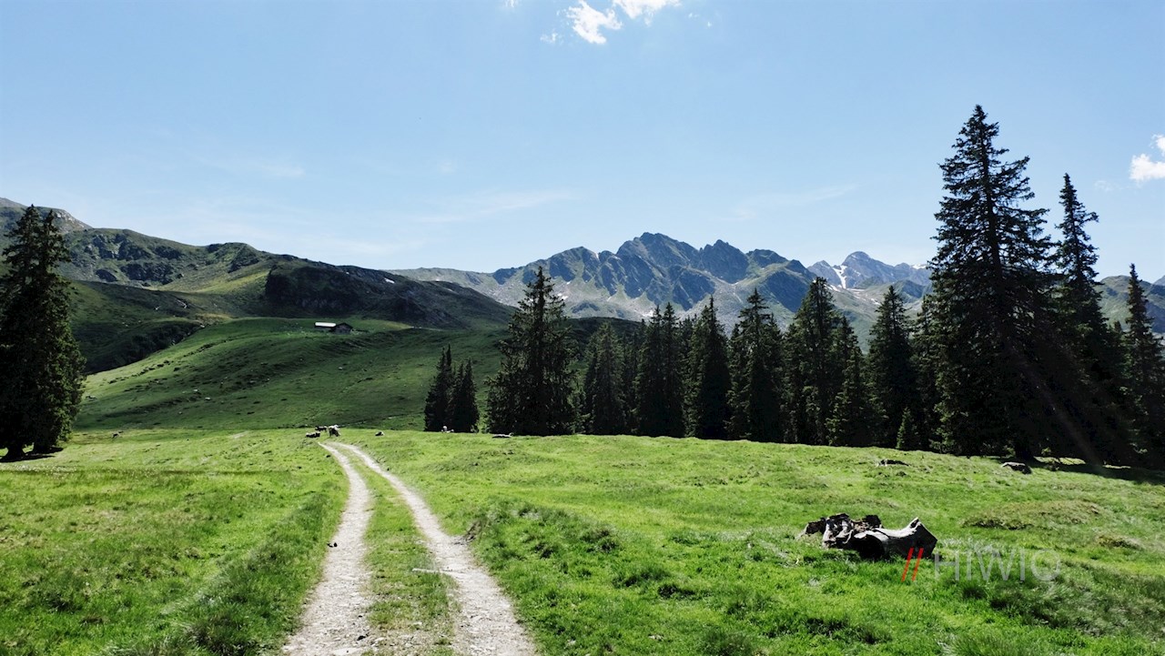 Nahe der Waldgrenze geht der Pfad in einen breiten Güterweg über. Er führt im sanften Anstieg durch friedvolle Weidewiesen zur urigen Inneren Wumblsalm.