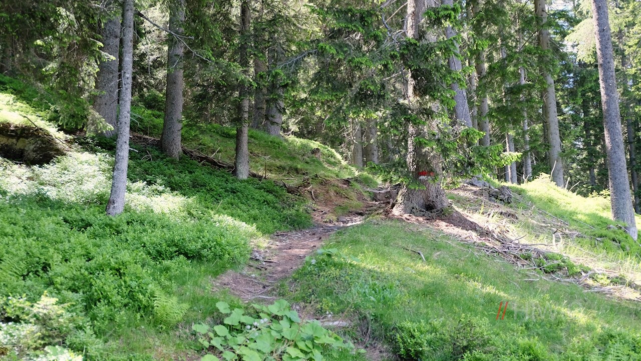 Vom Forstweg zweigt wenig später ein schmaler Pfad in Richtung Innere Wumblsalm ab, der im Schatten hoher Bäume durch den Wald ansteigt.