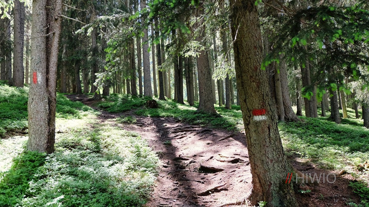 Die Wanderung zu den Wumblsalmen nimmt an jenem Forstweg ihren Anfang, der wenige Kilometer hinter dem kleinen Ratschinger Weiler Bichl am linken Straßenrand abzweigt. Der mit der Nr. 10 markierte Weg taucht sogleich in einen schattenverheißenden Nadelwald ein.