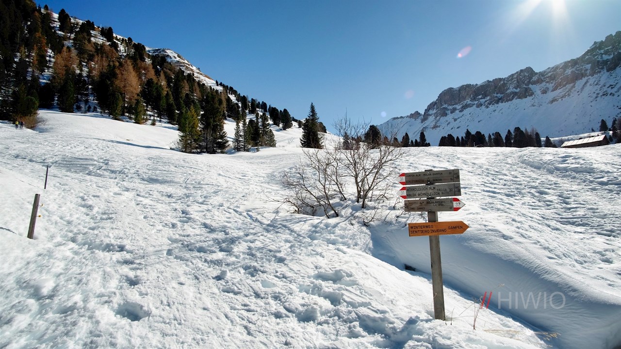Hier folgt man zunächst dem Winterwanderweg Nr. 33 in Richtung Gampenalm.