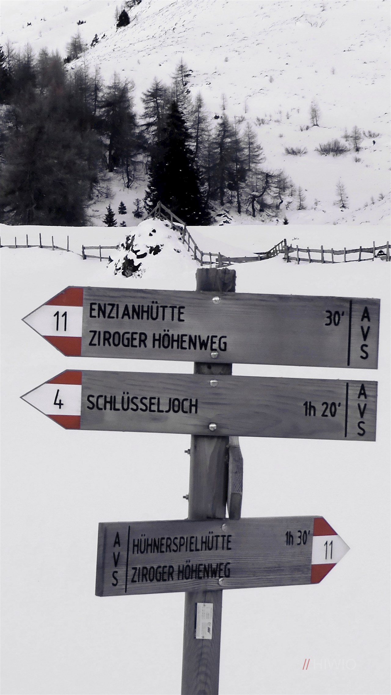 Die Winterwanderung zur Enzianhütte in Zirog nimmt südlich der Fraktion Brennerbad ihren Anfang. Ein großes Schild mit der Aufschrift „Enzianhütte / Rif. Genziana“ weist am rechten Straßenrand den Weg zum Parkplatz.