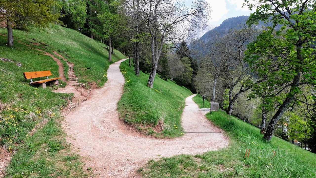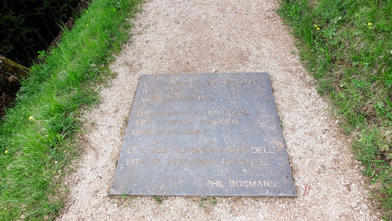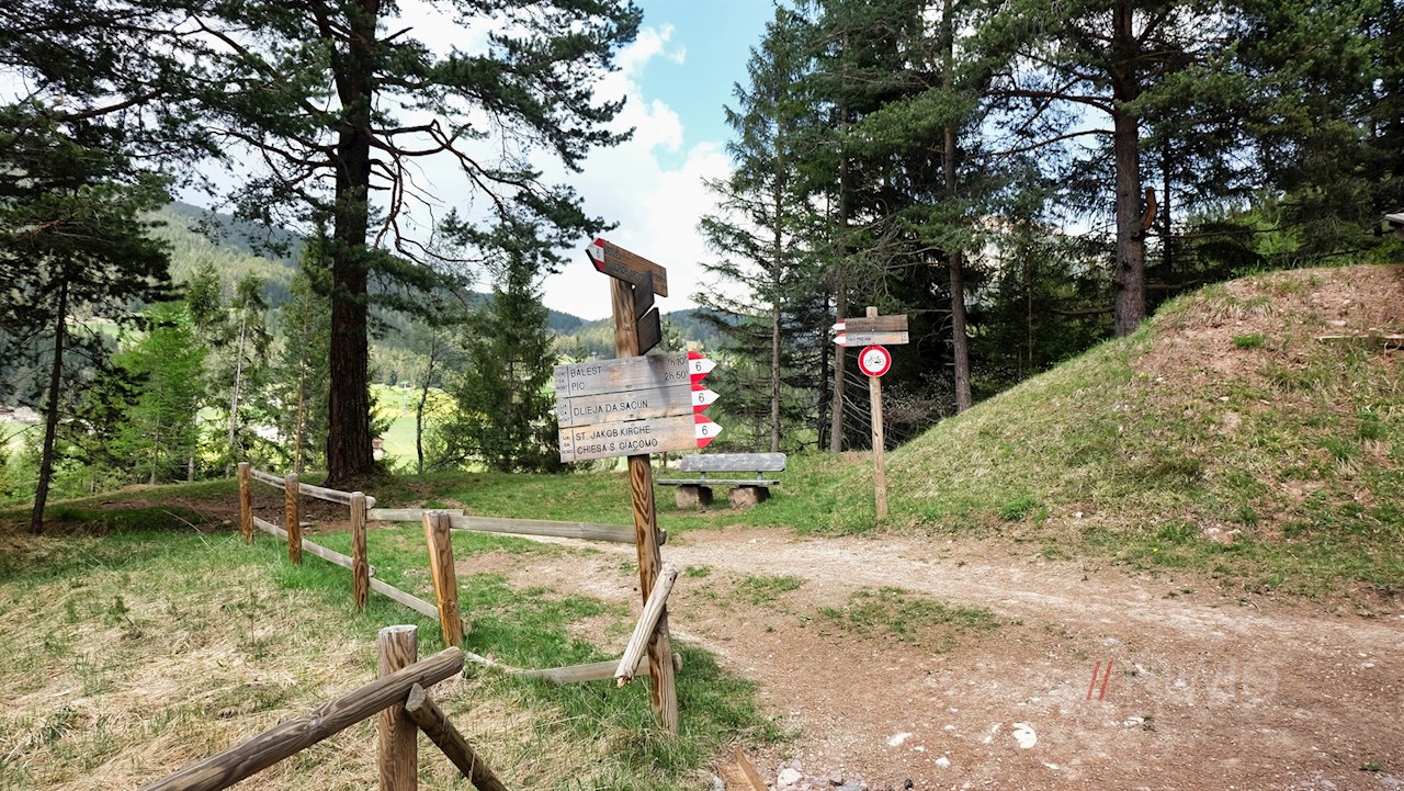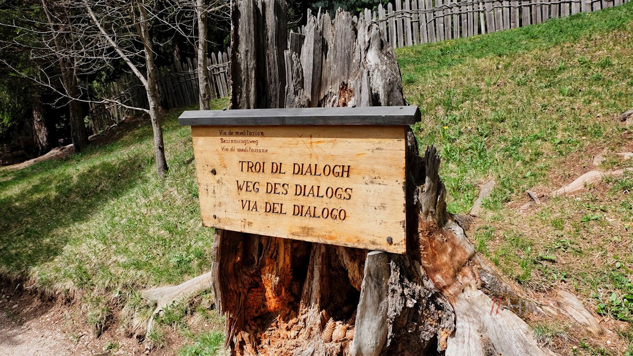Wenig später zweigt am linken Straßenrand der Weg Nr. 6 ab. Er führt zunächst über die sanft ansteigende, serpentinenförmig angelegte Besinnungspromenade „Weg des Dialogs“, entlang derer deutsch-, ladinisch- und italienischsprachige Inschriften zum Nachsinnen und Verweilen einladen. Das Ende des Besinnungsweges markiert eine imposante, holzgeschnitzte Christusfigur, hinter welcher der Weg sanft durch einen schattenspendenden Wald ansteigt.