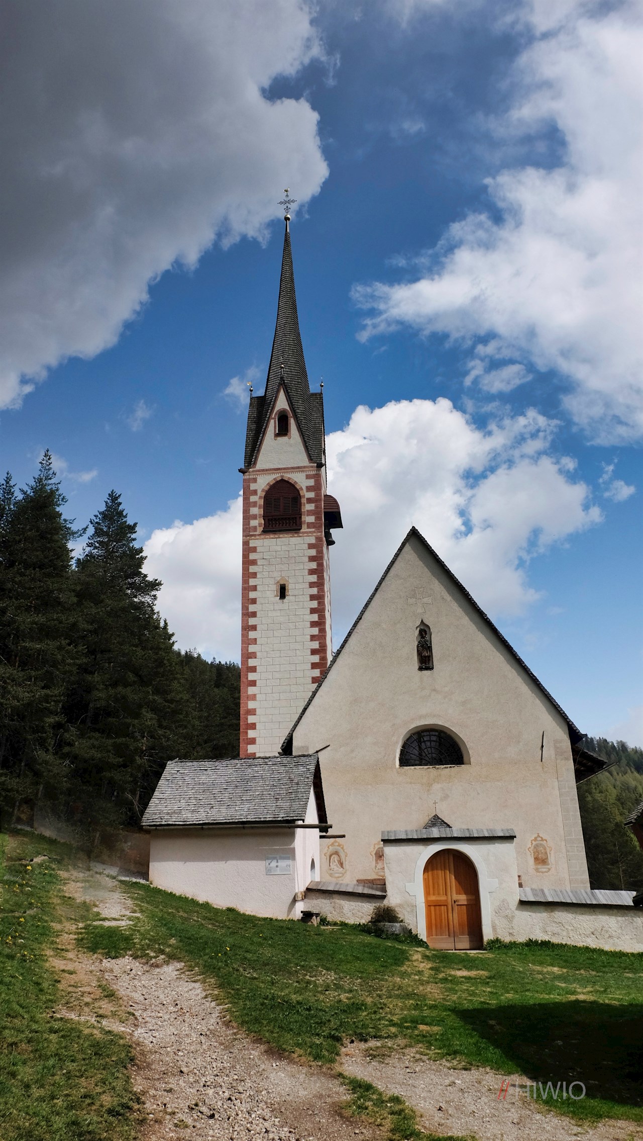 Nach insgesamt etwa 45 Minuten erreicht man das spitztürmige Kirchlein, das sich inmitten einer malerischen Lichtung mit Blick auf den Langkofel, den Plattkofel und den Sellastock präsentiert. Im Jahre 1283 erstmals urkundlich erwähnt, ist es seit jeher Ziel von Bittgängen. Die spätgotischen Wandmalereien im Chorraum und das imposante Christophorusfresko an der Südfassade wurden im 15. Jahrhundert von Meistern der Brixner Schule gefertigt. Die barocke Innenausstattung ging indes aus den Händen der Grödner Bildhauerfamilie Vinazer hervor.