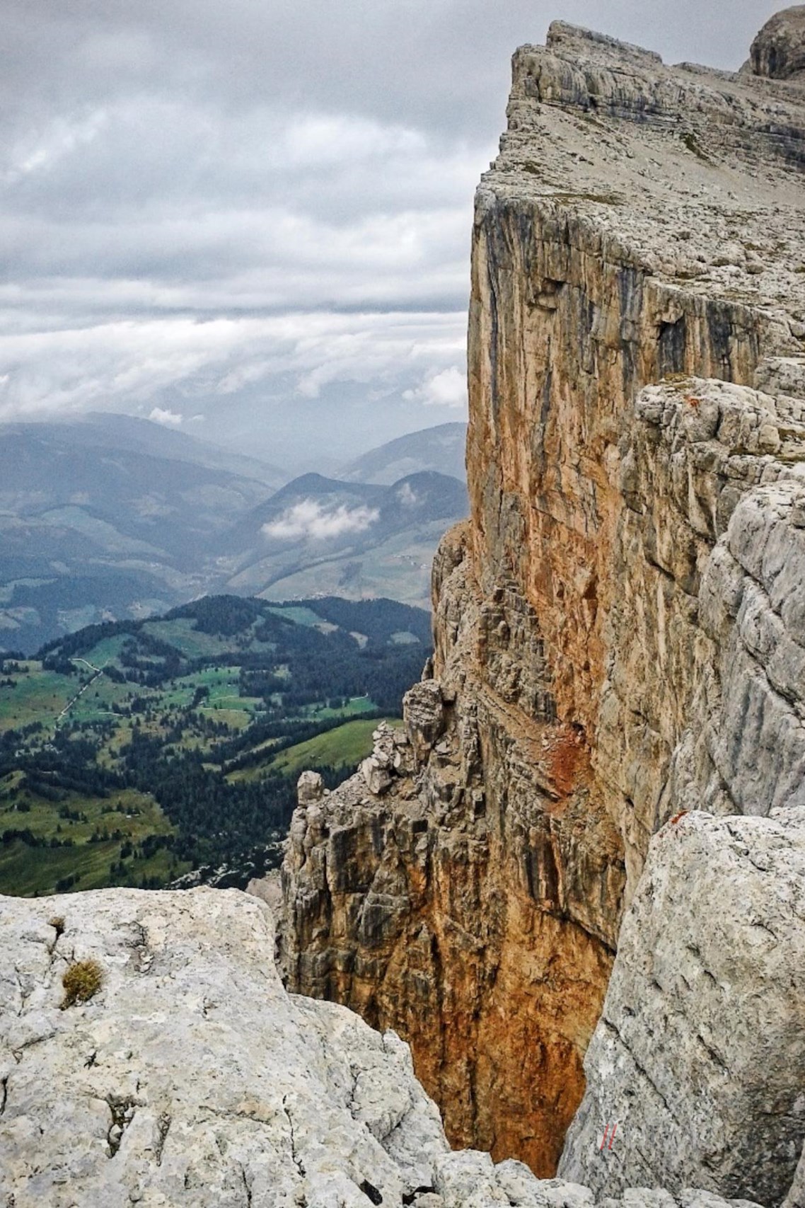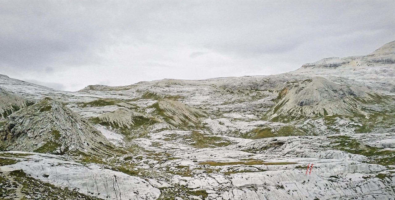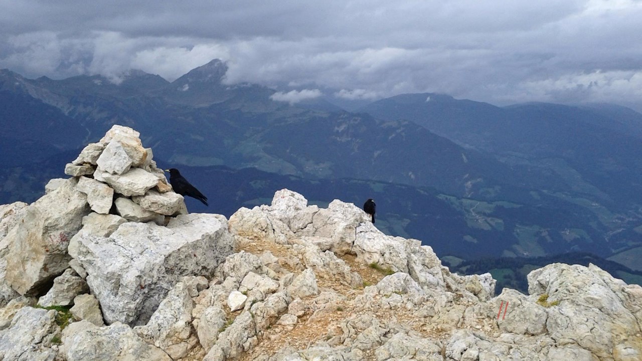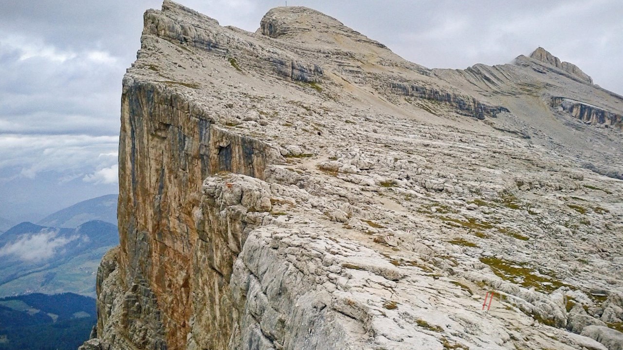 Nun schlängelt sich der gut markierte Weg serpentinenförmig durch das stetig ansteigende, karstige und geröllbeladene Gelände zum schlichten Gipfelkreuz des Heiligkreuzkofels empor. Auf 2.907 m Höhe erschließt sich hier ein atemberaubendes Panorama.
