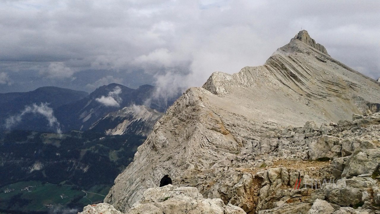 Oben angekommen, zweigt rechts der markierte Steig 7B ab, auf dem man über schotter- und geröllbeladenes Gelände zur östlichen Gipfelflanke gelangt. Bereits hier genießt man einen im wahrsten Sinne des Wortes schwindelerregenden Ausblick.