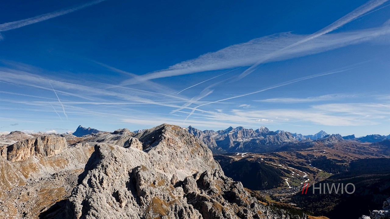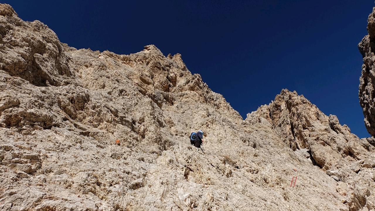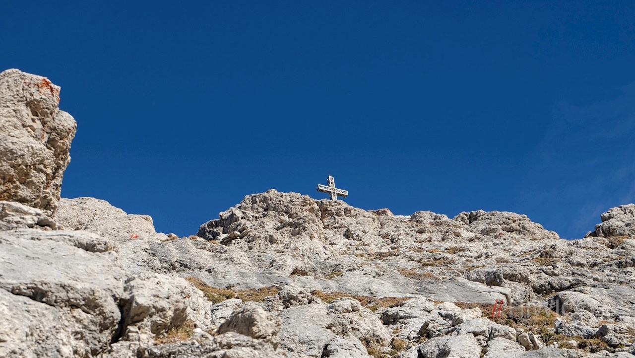 Stets den Punktmarkierungen bzw. den Seilen folgend, erreicht man schließlich das Gipfelkreuz der frei aufragenden Großen Cirspitze, die mit einem beeindruckenden Dolomitenblick aufwartet. Insbesondere die Geisler, die Puezspitzen, der Sellastock, der Langkofel und der Schlern stechen ins Auge.