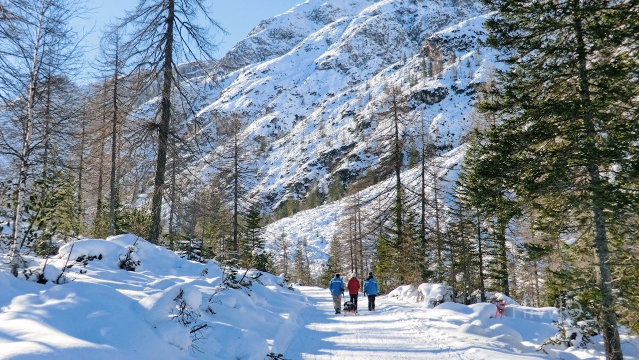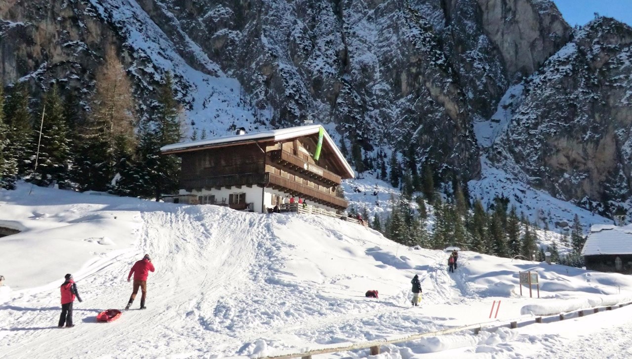 In der Dreischusterhütte werden die Wanderer auch im Winter willkommen geheißen. Zu dieser idyllisch gelegenen Almhütte bei Sexten führt ein breiter Wanderweg, auf dem man mit der Rodel zurückfahren kann.