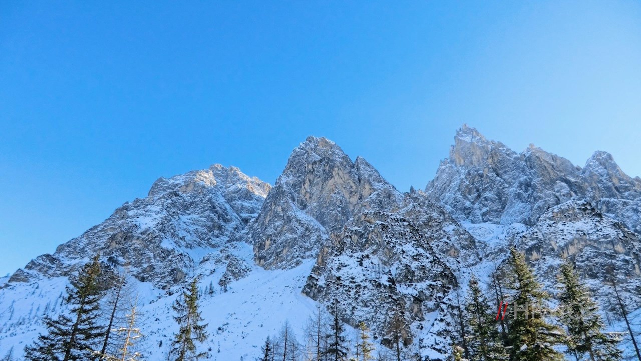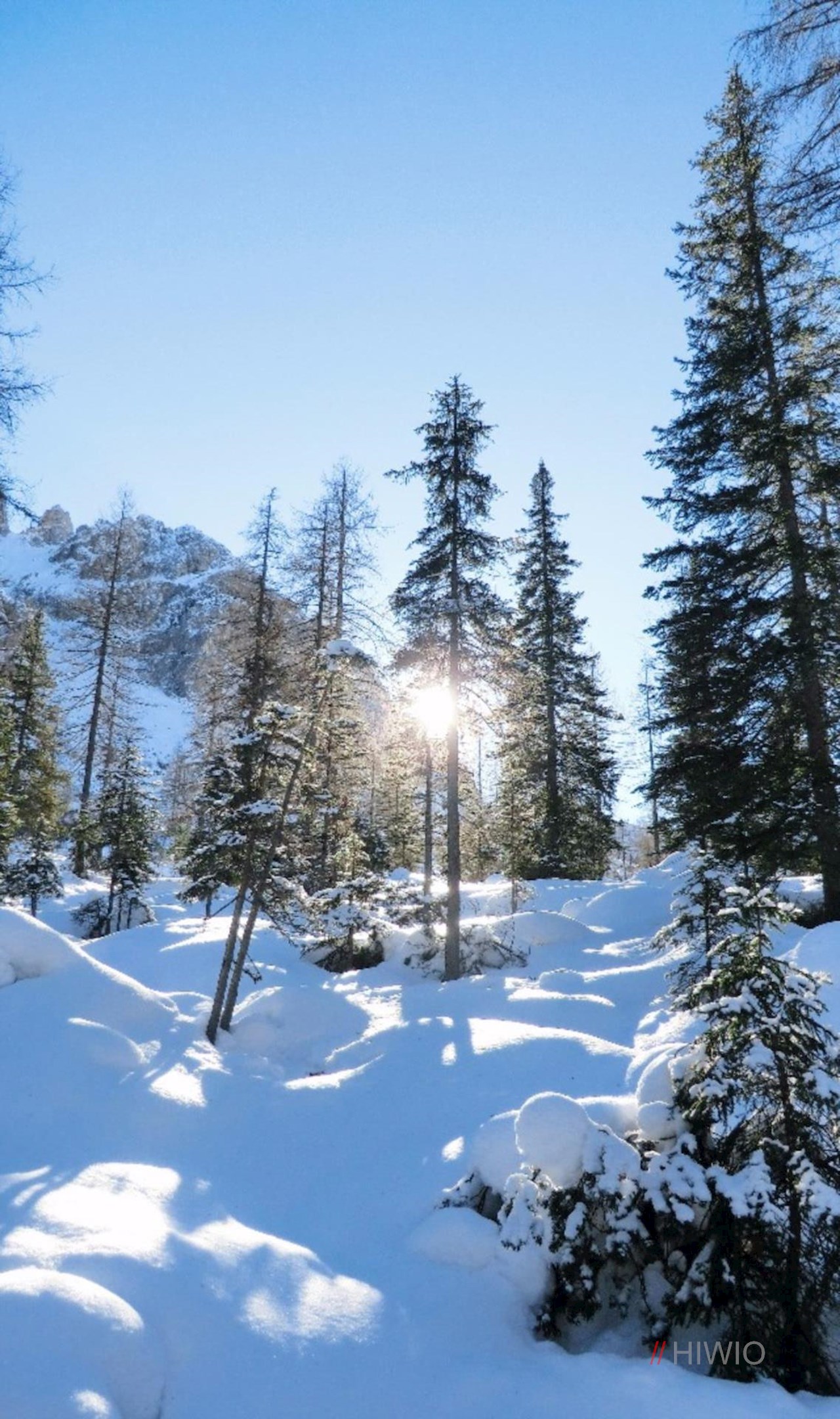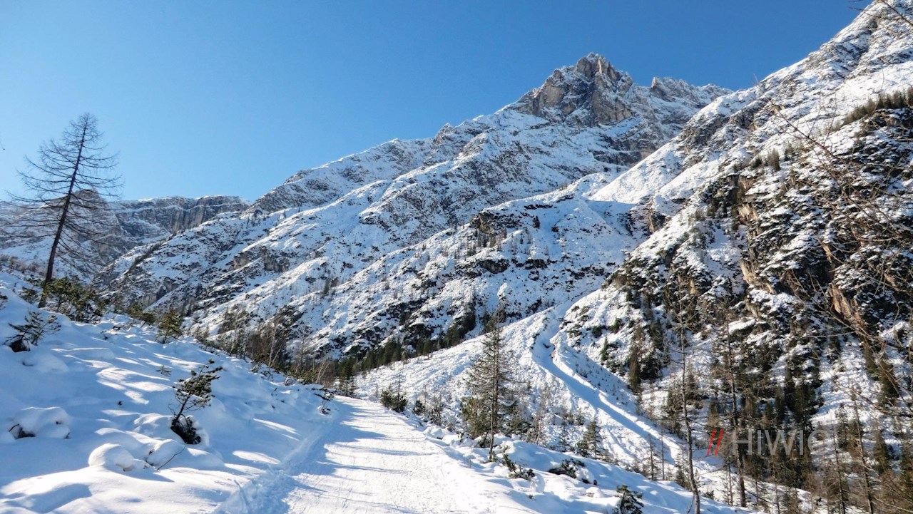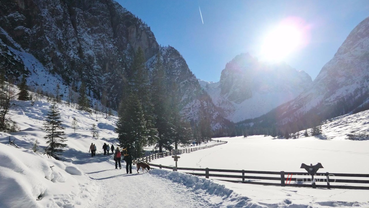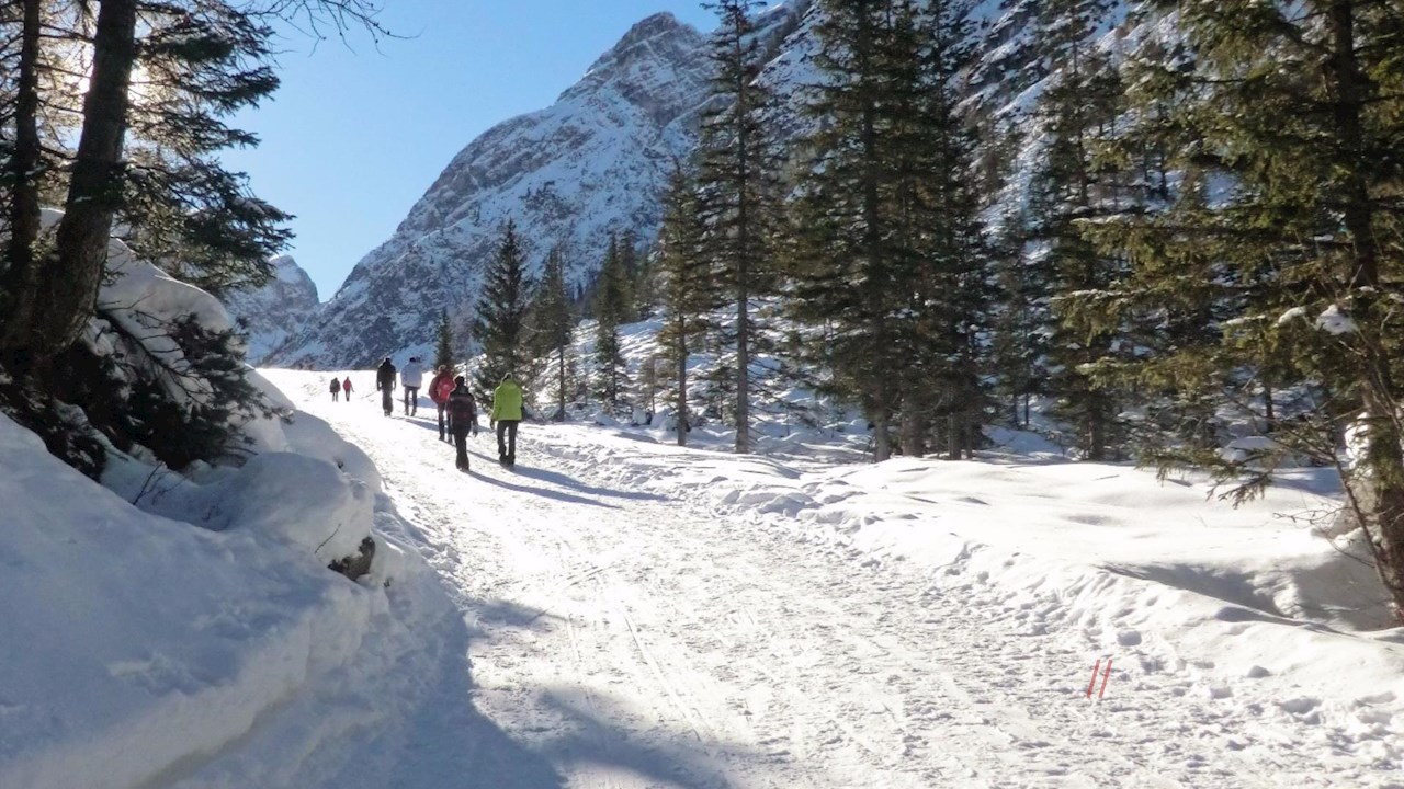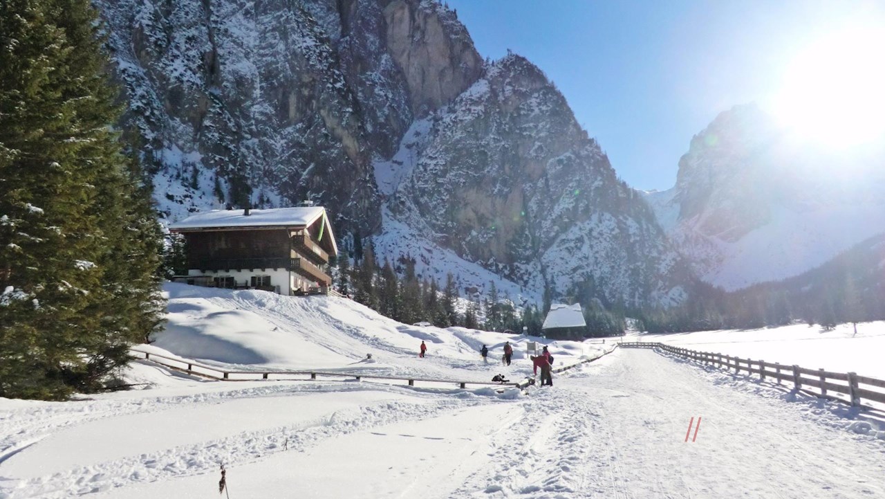 Die gemütliche Winterwanderung zur Dreischusterhütte nimmt auf dem zwischen Innichen und Sexten gelegenen Wanderparkplatz am Eingang ins Innerfeldtal ihren Anfang.