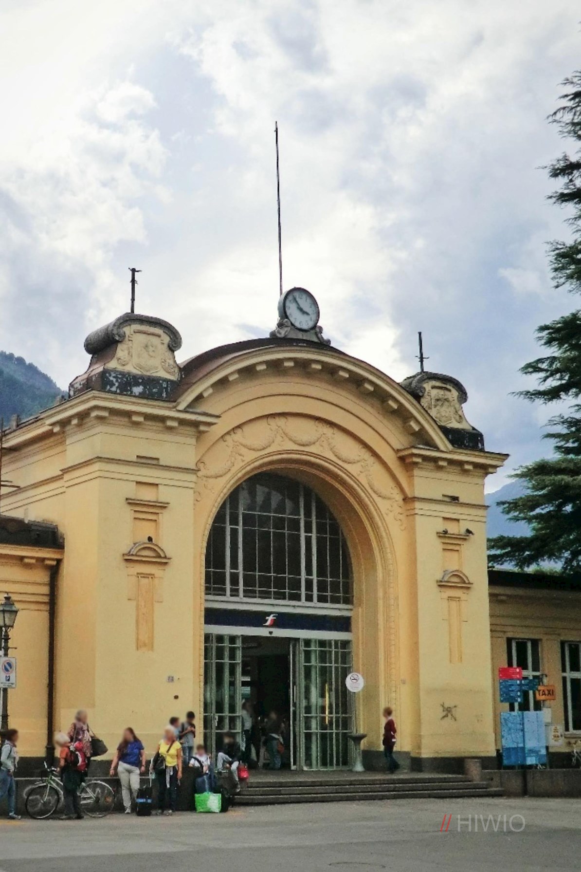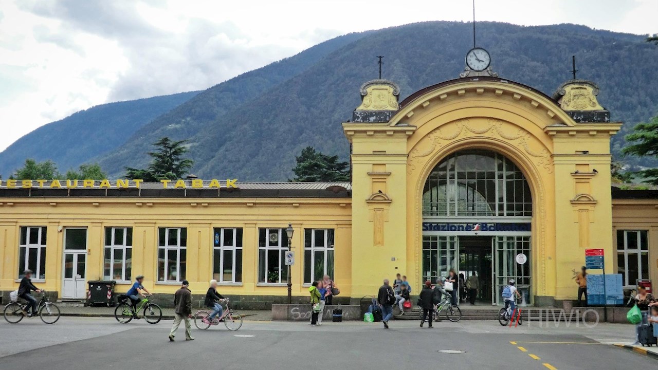 1881 also wurde die aufstrebende Kurstadt an das internationale Schienennetz angeschlossen. Damals war der Bahnhof noch stadtnaher gelegen. Das heutige Jugendstil-Bahnhofsgebäude im Westen der Stadt geht indes auf das Jahr 1906 zurück: Im Zuge der Errichtung der Linie Meran-Mals wurde der alte Bahnhof abgerissen und durch einen mondäneren, nordwestlicher gelegenen ersetzt.