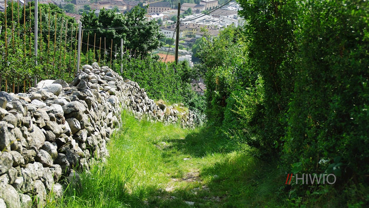 Die letzten Häuser der Stadtteile Stufels und Kranebitt hinter sich lassend, führt der Pfad im steten, aber zumeist gemächlichen Anstieg durch Obstwiesen und ein kleines Laubwäldchen zum Parkplatz des Buschenschanks Guggenhof empor.