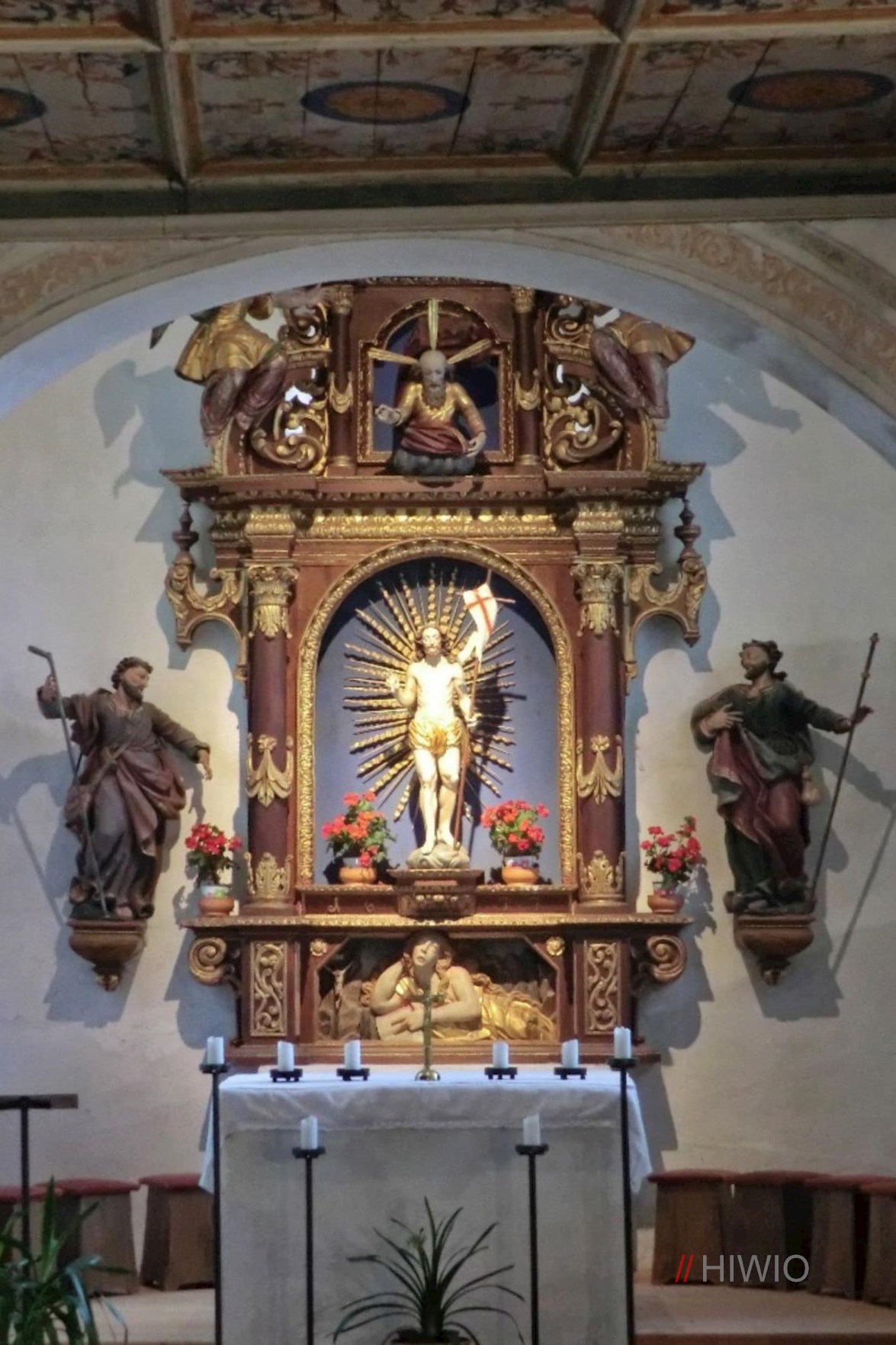 Das im 13. Jahrhundert erstmals erwähnte Gotteshaus vereint romanische und barocke Elemente in sich. Besonders beeindruckend sind die Fresken auf dem Westportal, welche den hl. Christophorus, den hl. Oswald, Maria Magdalena, die Gottesmutter Maria mit dem Jesuskind, den hl. Laurentius und den hl. Cyrill abbilden.