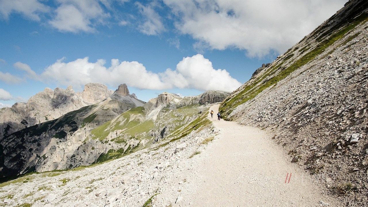 Below the Rifugio Auronzo mountain hut, take hiking trail no. 101. It leads along the eastern side of the Tre Cime di Landro almost flat to the inviting Rifugio Lavaredo mountain hut at an altitude of 2,344 meters.