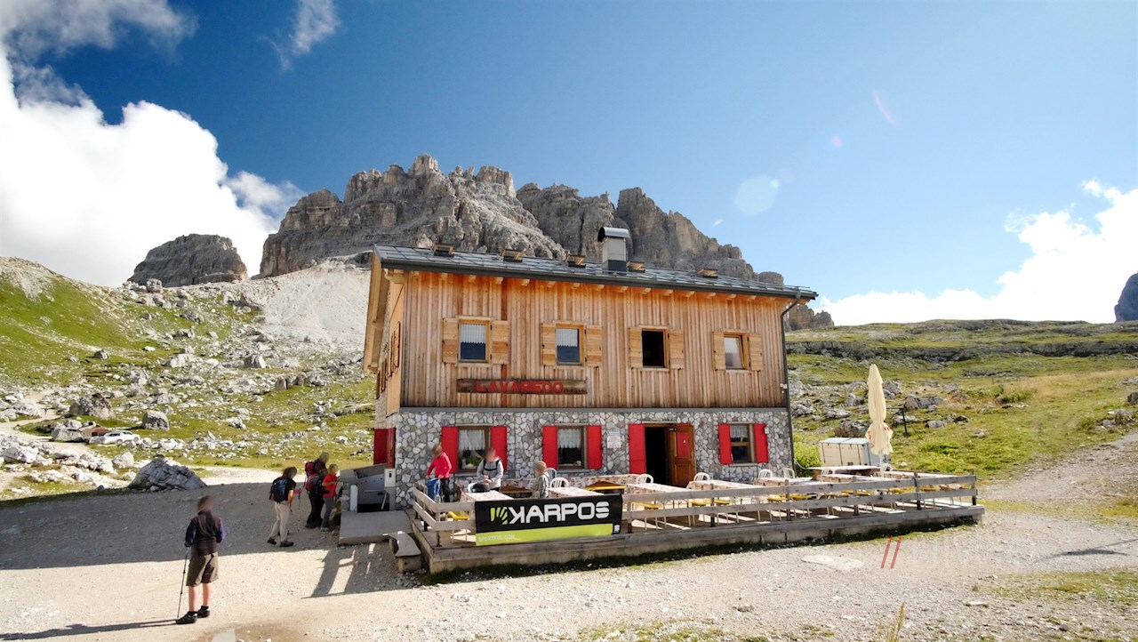 From the Rifugio delle Tre Cime di Lavaredo continue along hiking trail no. 105 in the direction of Langalm mountain hut. It first descends to the nearby Rienzboden and then winds its way gently up to the idyllic Langalm mountain hut made of light-colored natural stone. At the foot of the imposing Tre Cime di Lavaredo north face, the innkeepers here conjure up delicious meals prepared from regional ingredients .