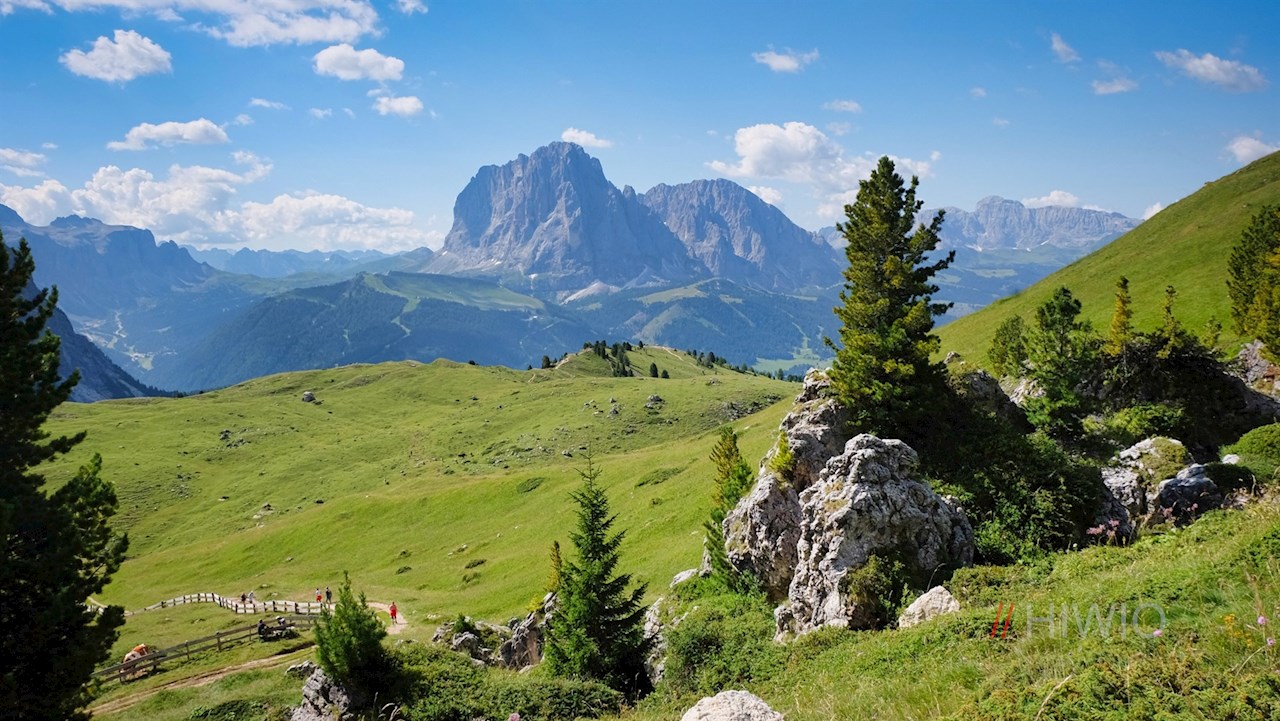 Behind the Pieralongia mountain hut, hiking trail no. 2B branches off to the Seceda. It leads in an easy ascent through alpine meadows rich in views and changes a little later into the now steeper trail no. 1.