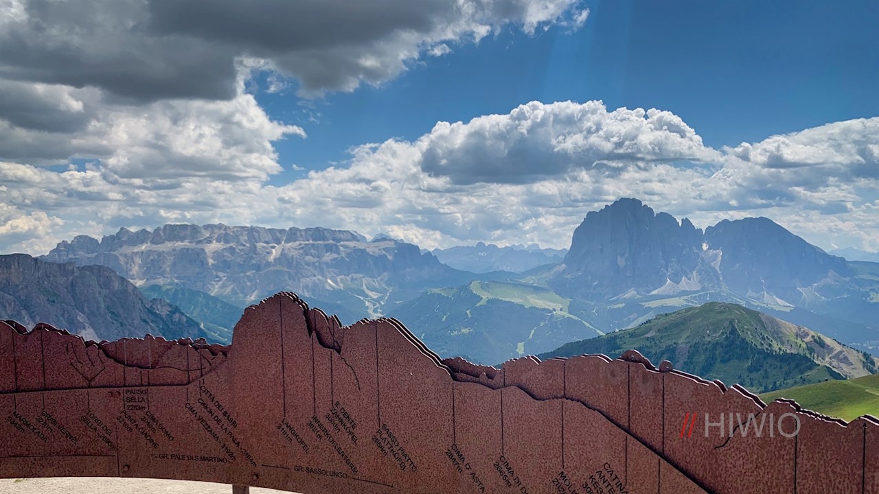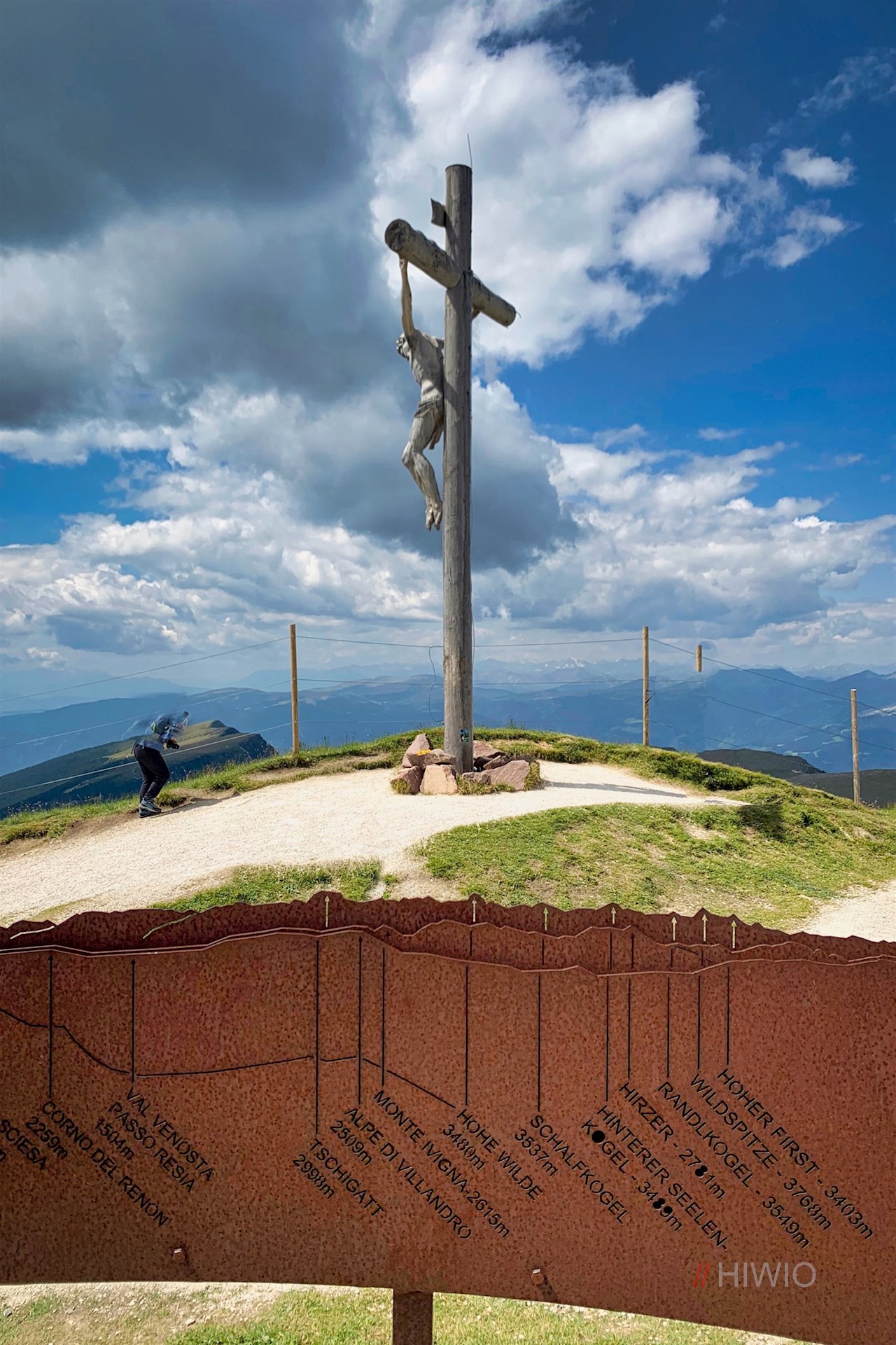 From the eastern side of the Seceda, the almost flat path no. 6 crosses the meadows in the direction of the Seceda cable car, behind which lies the most panoramic point of Seceda. A little later, next to the wood-carved summit cross, a breathtakingly far-reaching view unfolds, stretching from the Dolomites to the Brenta, Adamello and Ortles groups, all the way to the Ötztal Alps and the Stubai Alps. A panoramic platform lists the names of the most prominent mountains, which include the Sella massif, the Sassolungo group and the Sciliar. The most sought-after photo motif, however, are the Geisler peaks towering to the side.