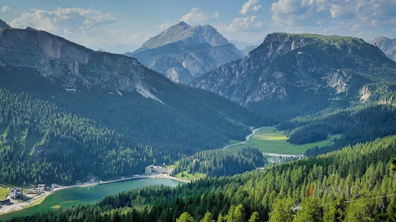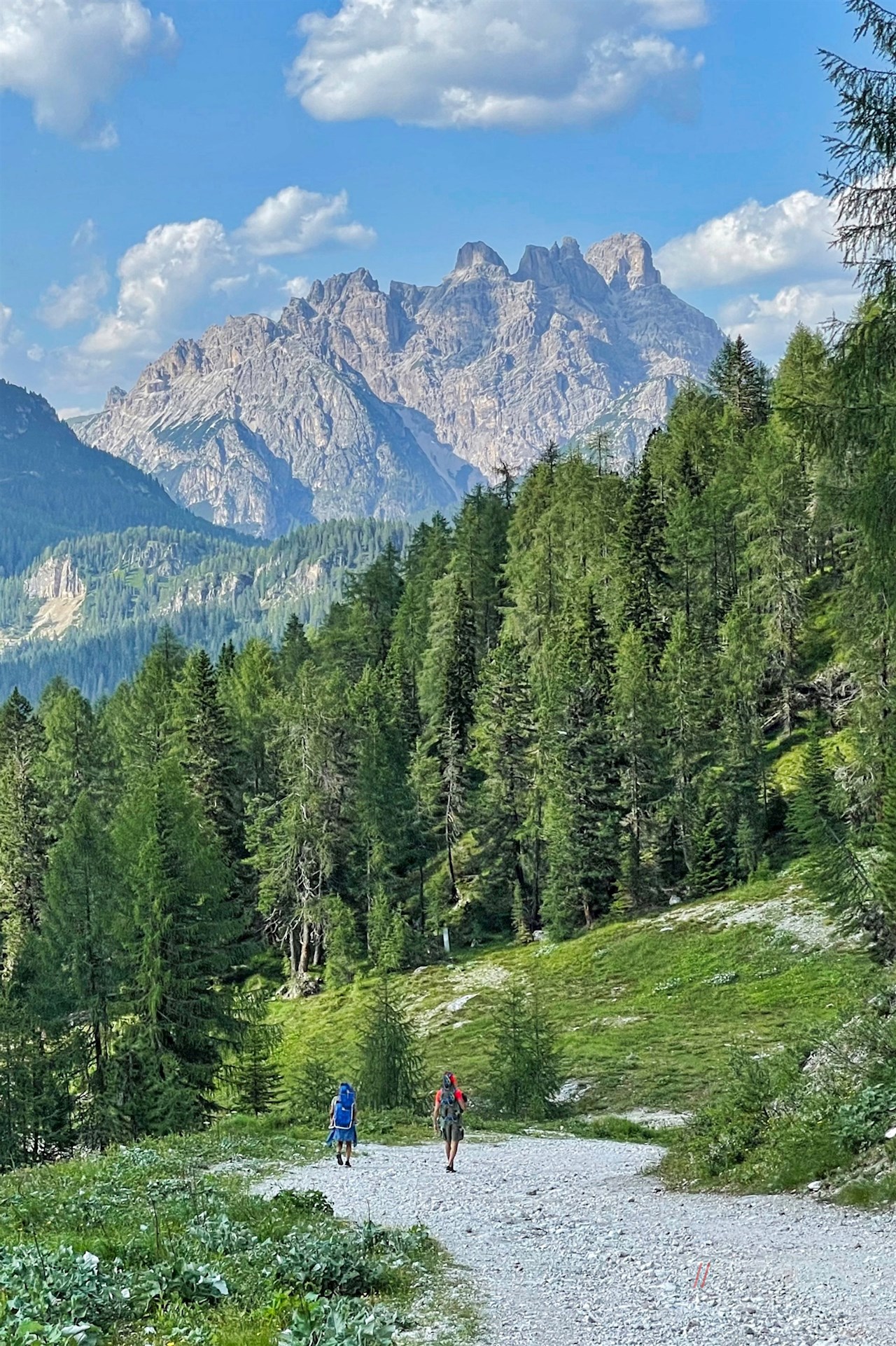 The hike to the Rifugio Col de Varda mountain hut begins at the shimmering Misurina lake, also known as the "Pearl of Cadore" because of its crystal clear waters and picturesque mountain scenery.