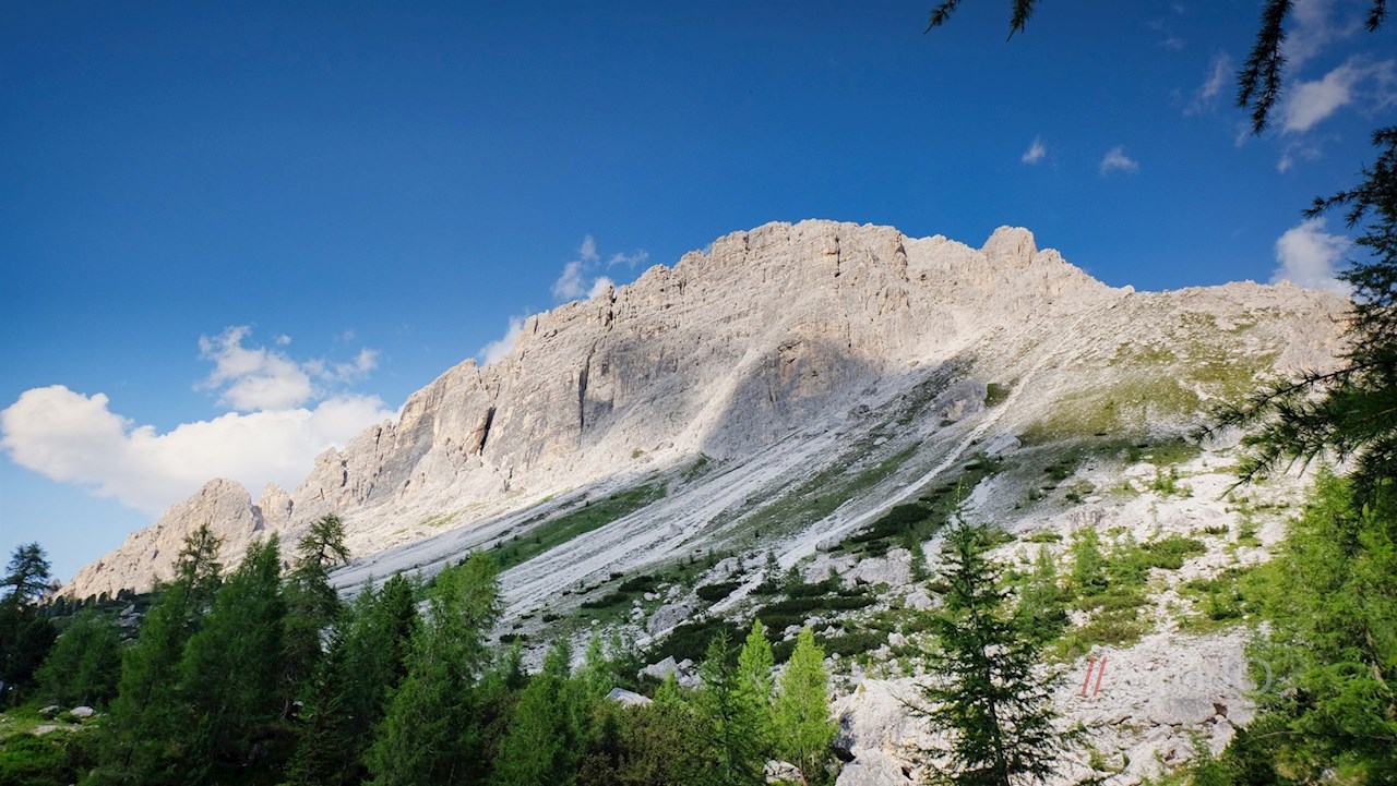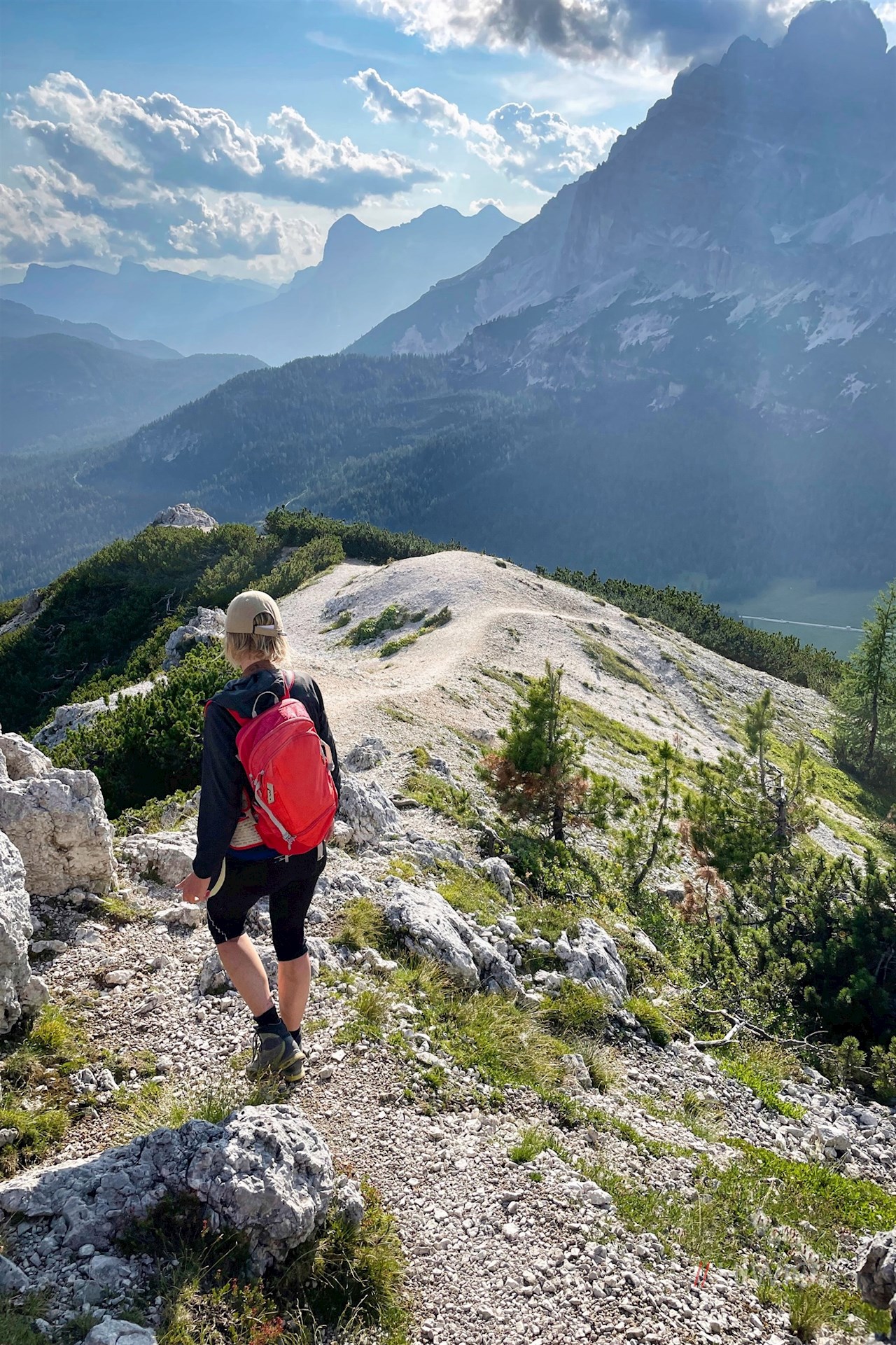 Just before the Rifugio Col de Varda mountain hut, a wooden sign with the inscription "Panorama" indicates the rocky and gravelly ascent to this panoramic "hill". A little later, an unexpectedly wide view of the surrounding Dolomites, the Val d'Ansiei on one side and the Lago di Misurina lake on the other side unfolds.