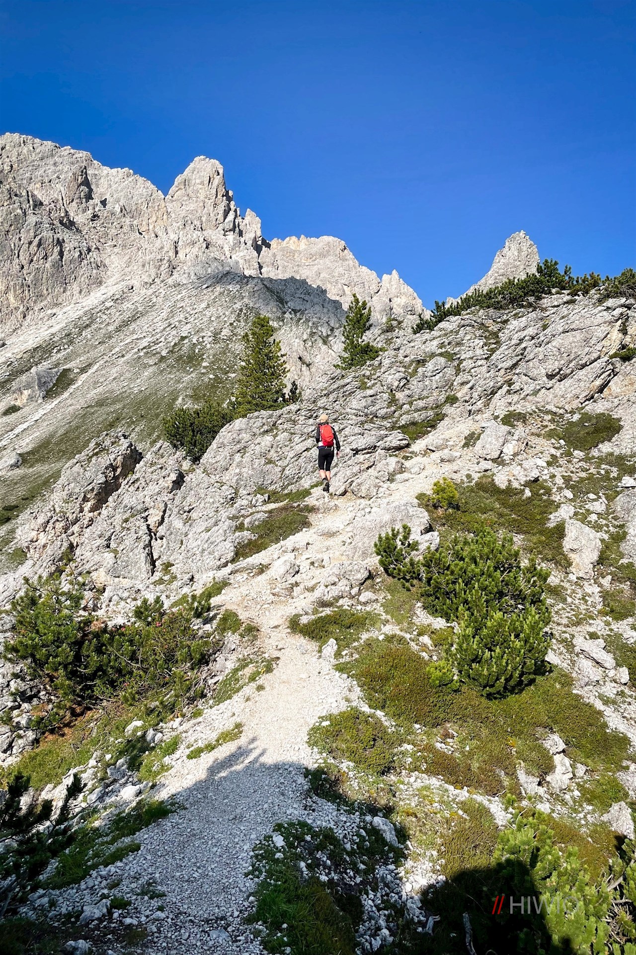 At the southern end of Lago di Misurina lake, hiking trail no. 120 points the way to Rifugio Col de Varda. It winds its way steadily up through forests and small meadows, opening up again and again beautiful views of the Dolomites rising all around.