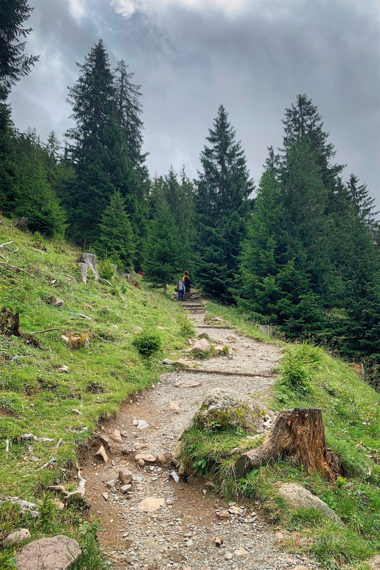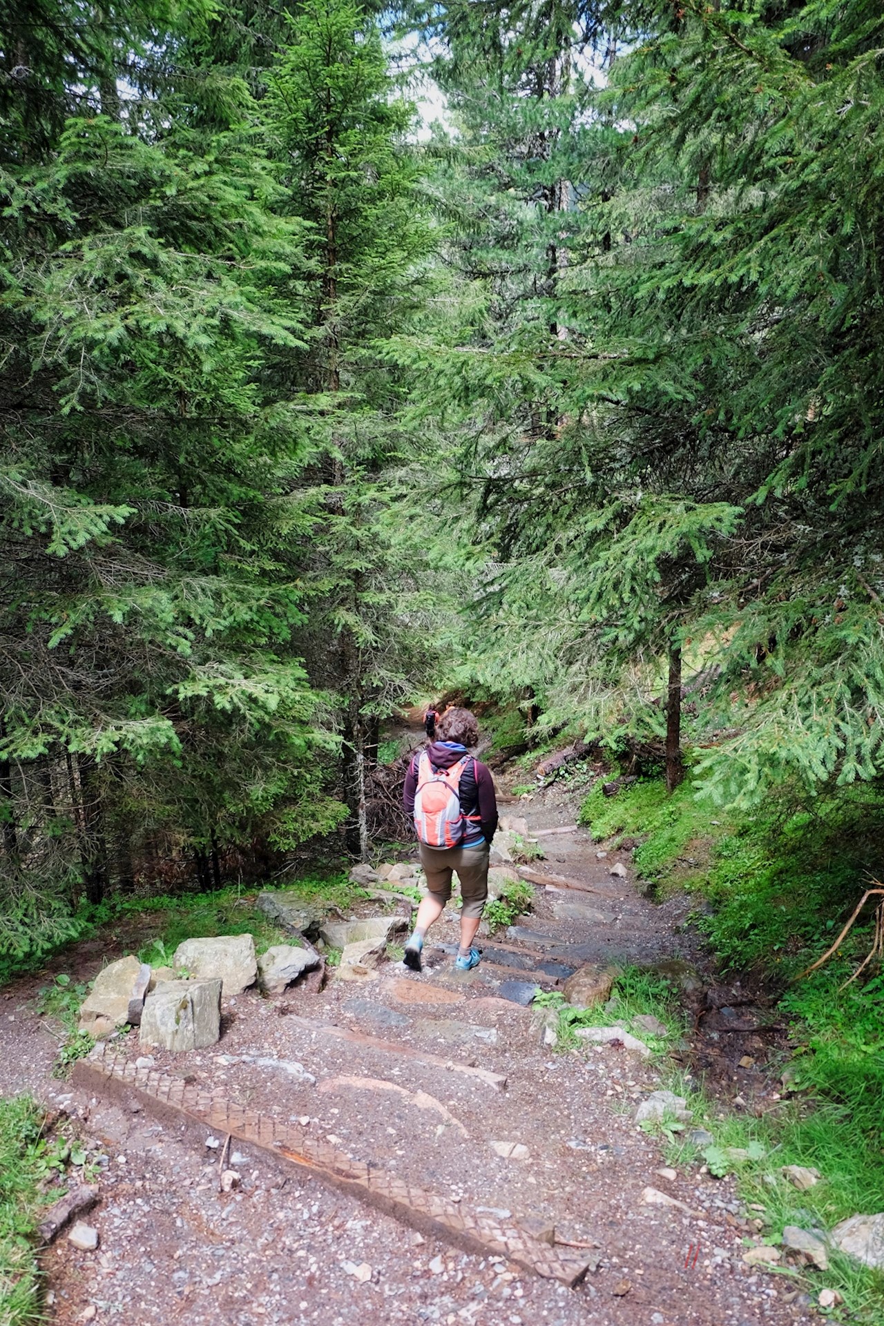 At the car park, the initially wide hiking trail no. 36 branches off in the direction of the Dusler Alm mountain hut. A little later it changes into a narrow, pleasantly ascending forest path, which finally leads over wooden planks and stone steps to the Dusler Alm mountain hut.