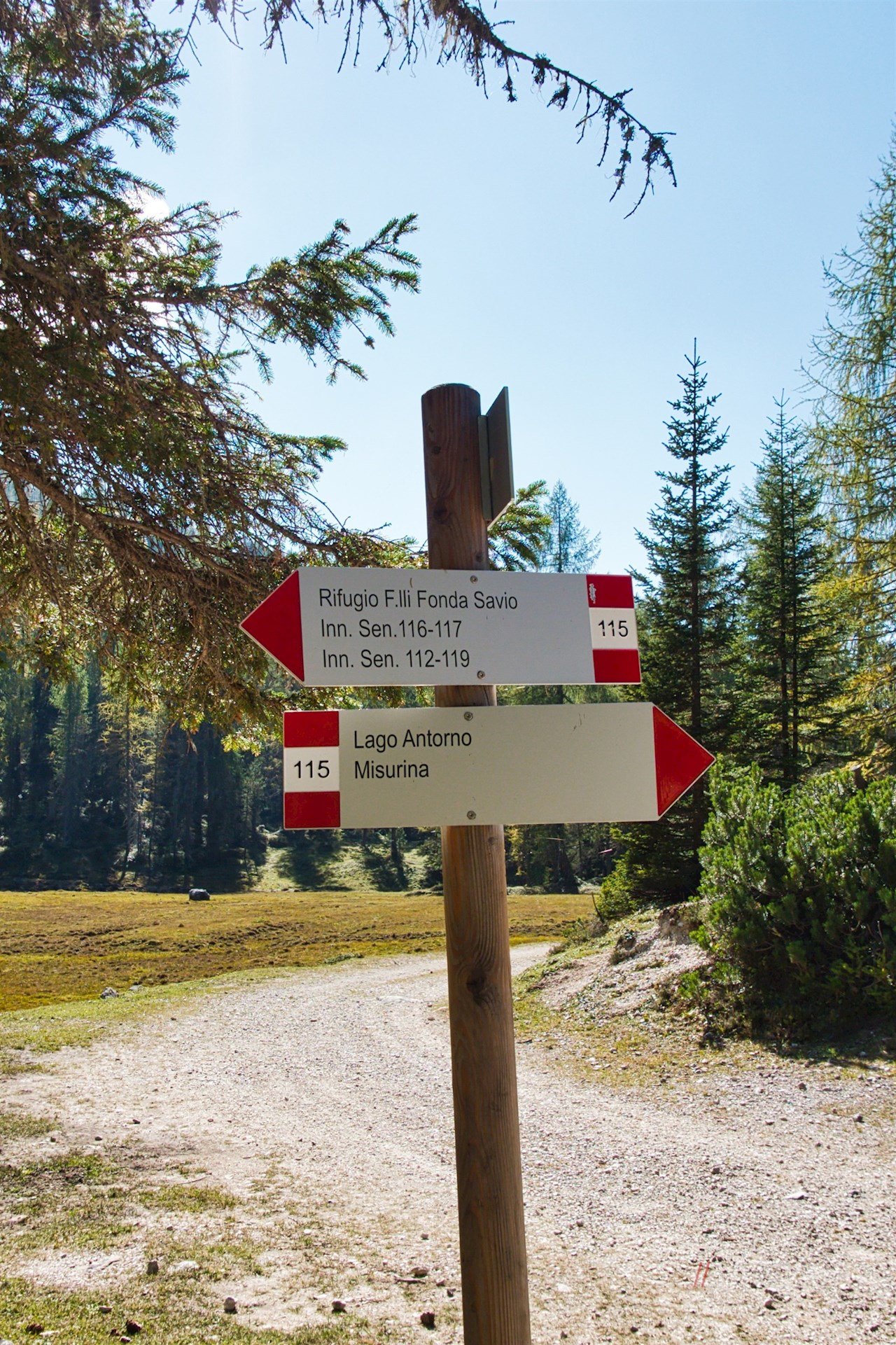 Following the sign no. 115 in the direction of Rifugio Fonda Savio mountain hut, the hiking trail first climbs steadily up the slopes covered with larch trees.