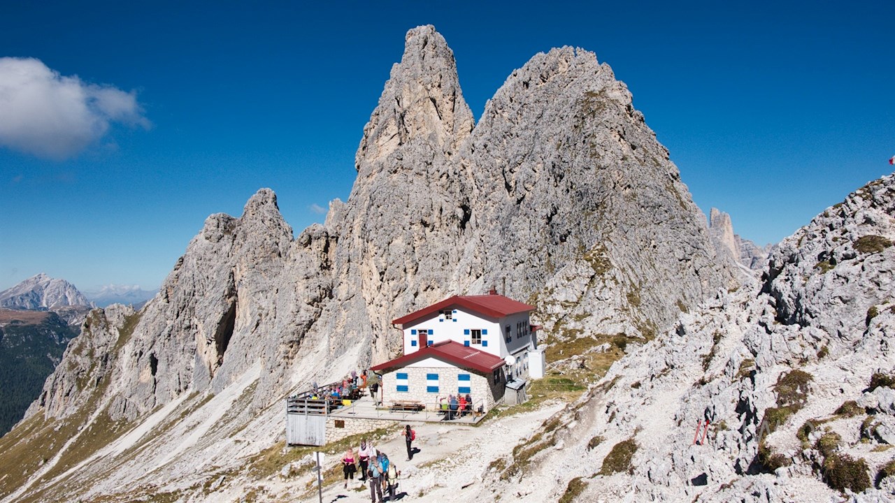 After a last steep section, you reach this family-run mountain hut at an altitude of 2,367 m, which invites you to enjoy a stop at the foot of the Torre Wundt. In addition to the lovingly prepared traditional dishes, hikers can also expect tempting homemade pastries.