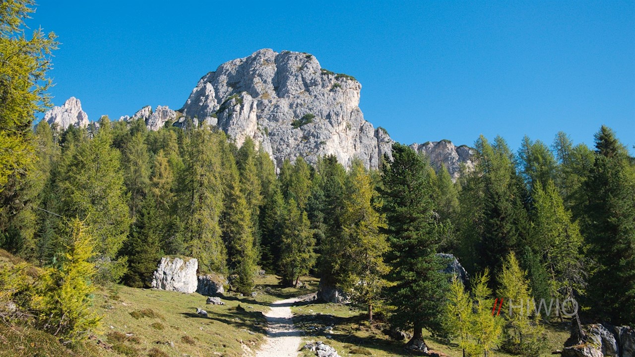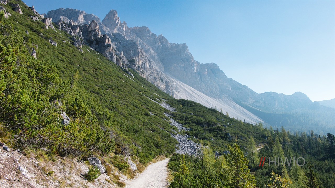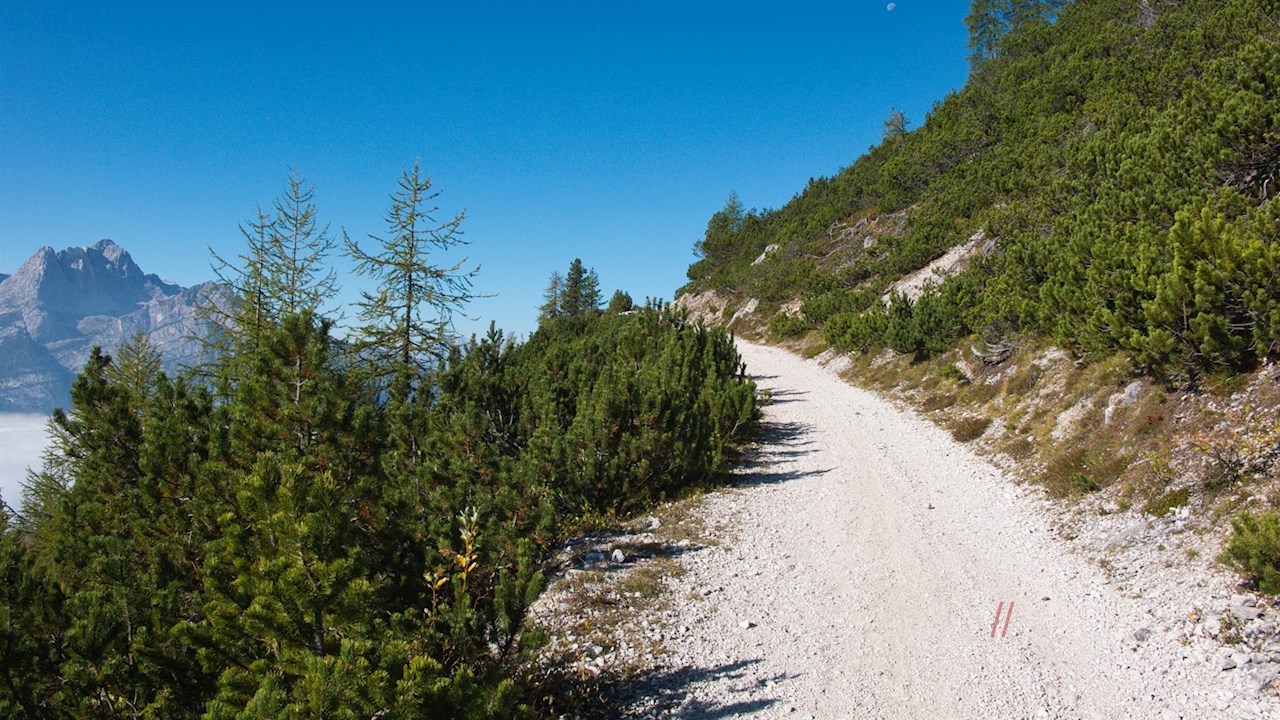 The return from the rifugio Citta di Carpi mountian hut is the same as the outward route, which now offers dreamy views of the 3,221 m high monte Cristallo.