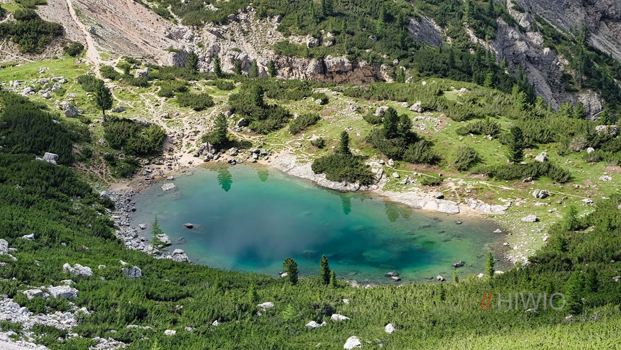 From the forcella lago Lagazuoi, the path descends rather steeply through the stone- and scree-strewn, serpentine gully to the shimmering blue-green Lagazuoi lake, which is already visible from above.