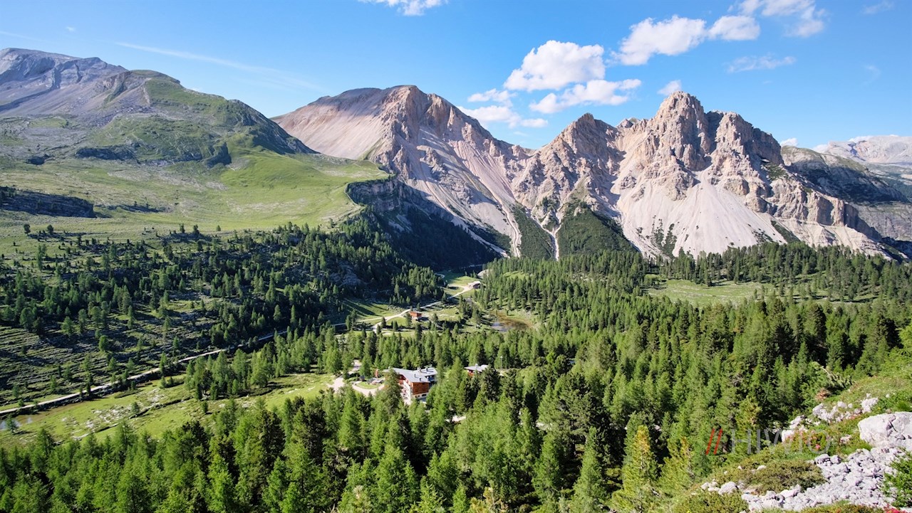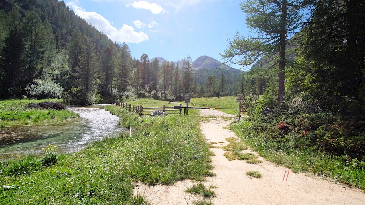 At an altitude of about 1,800 meters, the forest gradually thins out to reveal the steep rock faces of Col Bechei and the surrounding dolomites. In front of this impressive backdrop, the wide path leads partly level, partly in a rather steep ascent through the idyllic mountain meadows through which the Fanes stream flows.