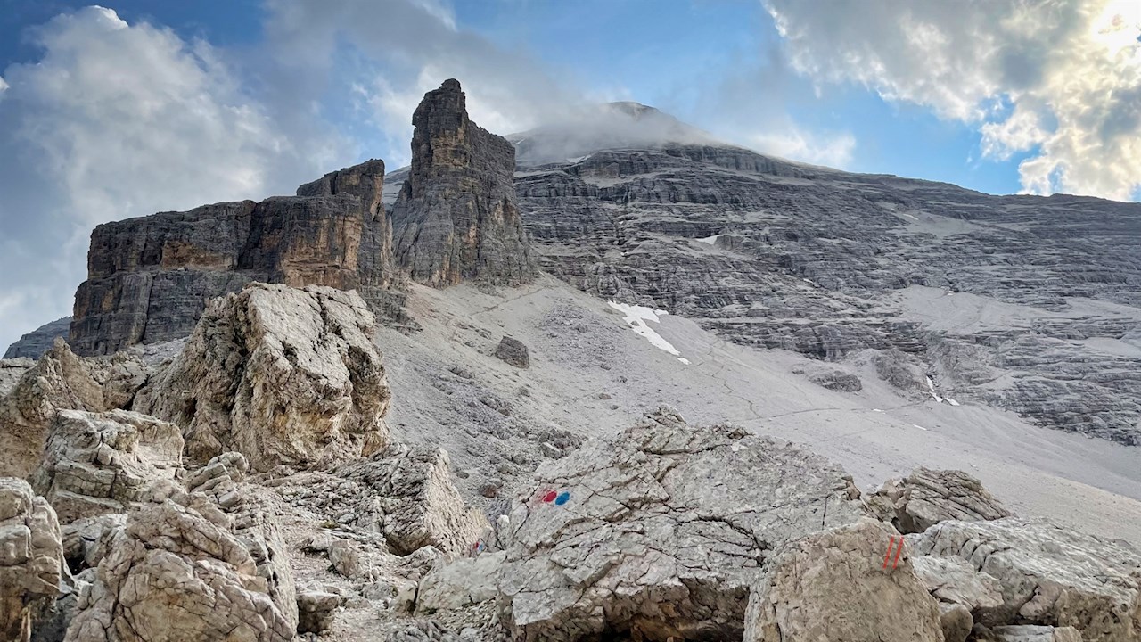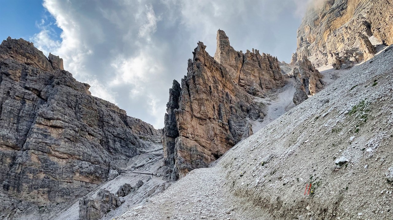Behind the rifugio Dibona mountain hut, the initially wide hiking trail no. 403 branches off and a little later climbs in numerous switchbacks through the large Tofana scree cut between the Tofana di Rozes and the Punta Anna. On the way, remains remind us of the mountain warfare in the first world war, with its many losses.