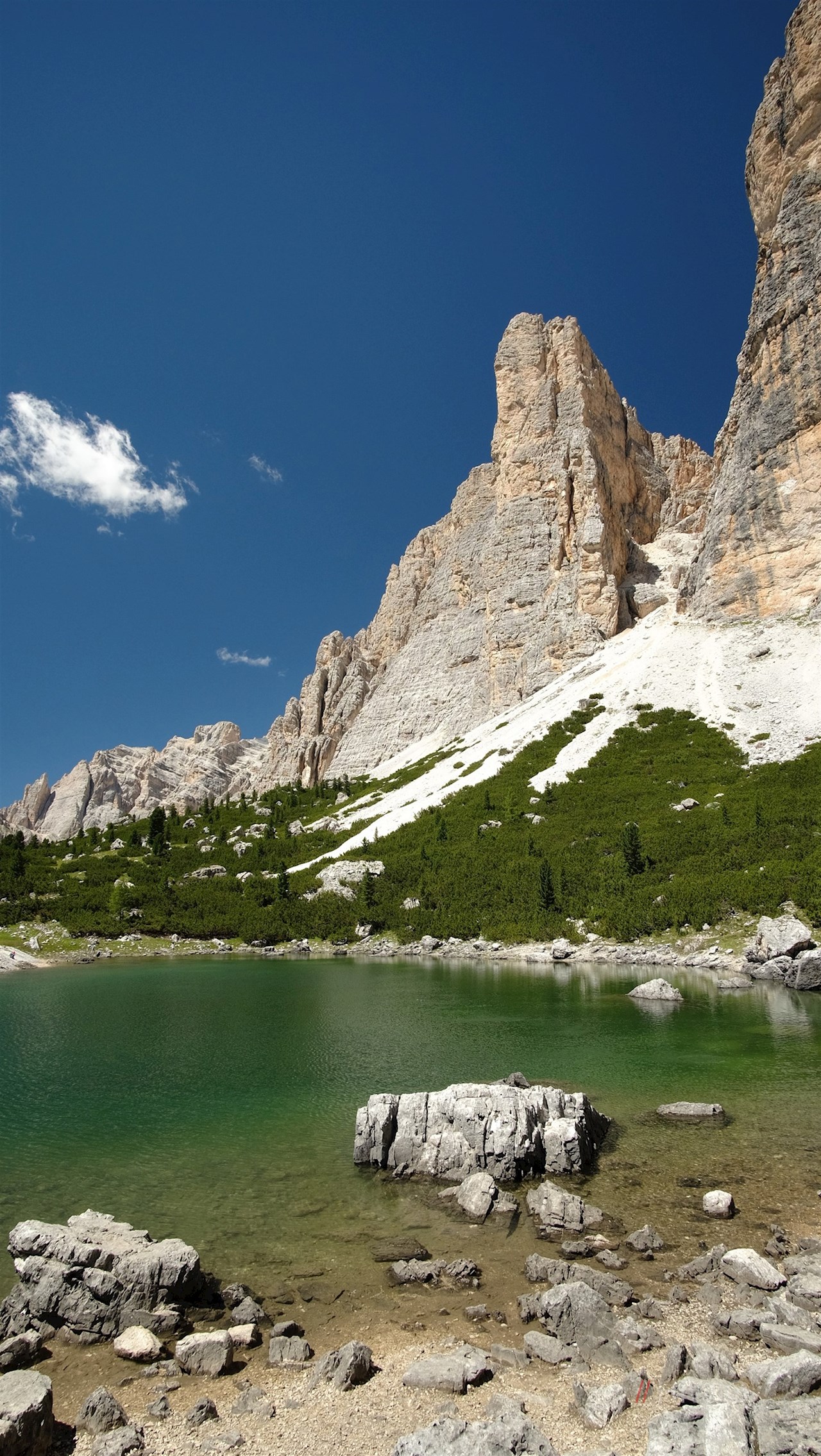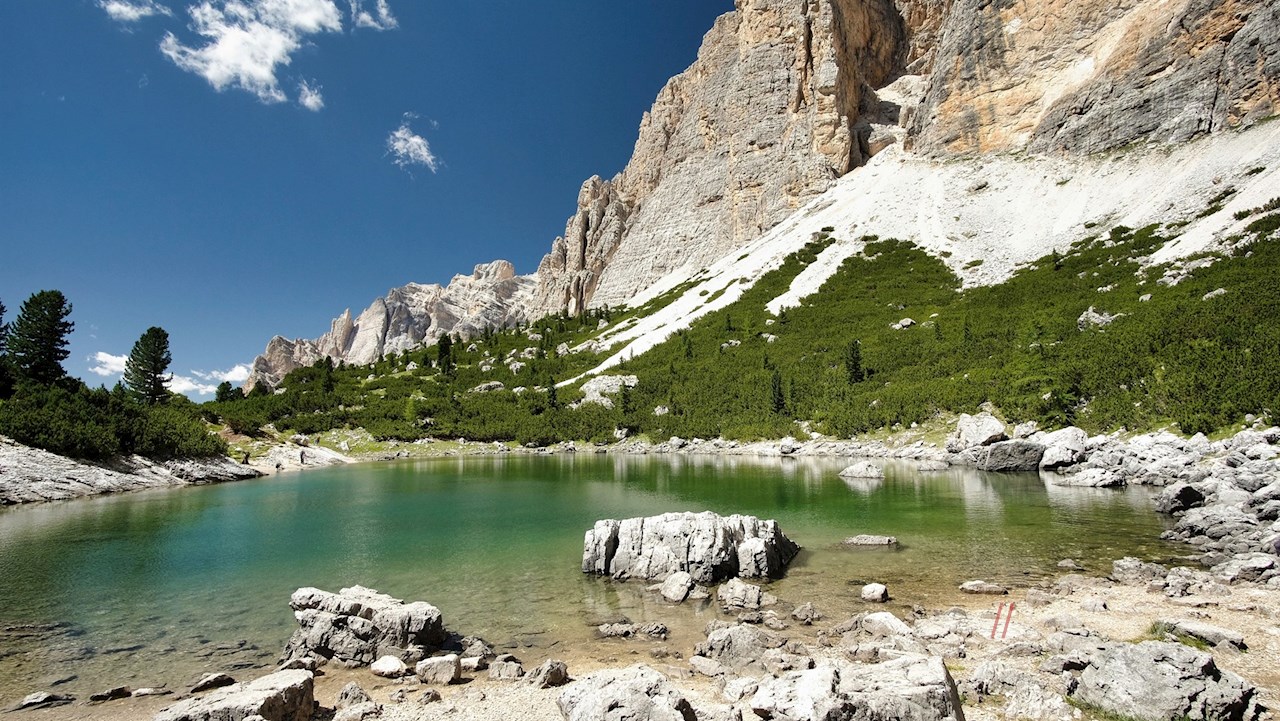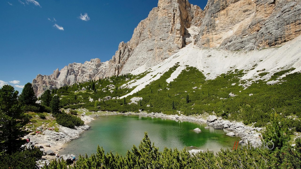 Finally, hiking trail no . 20B branches off to the left and leads to the picturesque Lagazuoi lake, surrounded by mountain pines, rocks and boulders, at the foot of the Scotoni peak.