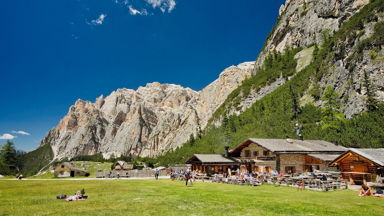 After a total of about an hour you reach the cozy mountain hut Scotoni, framed by the mighty rock walls of the cima del Lago peak, the Fanes peaks and the Scotoni peak. In the midst of a green alpine meadow, at 2,040 m above sea level, it invites you to enjoy a stop. The contemplative wooden chapel near it commemorates those soldiers who lost their lives in the first world war.