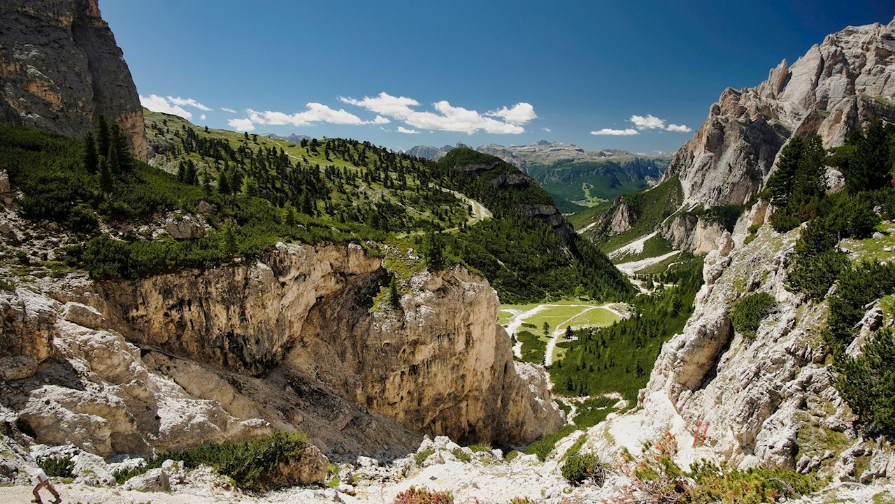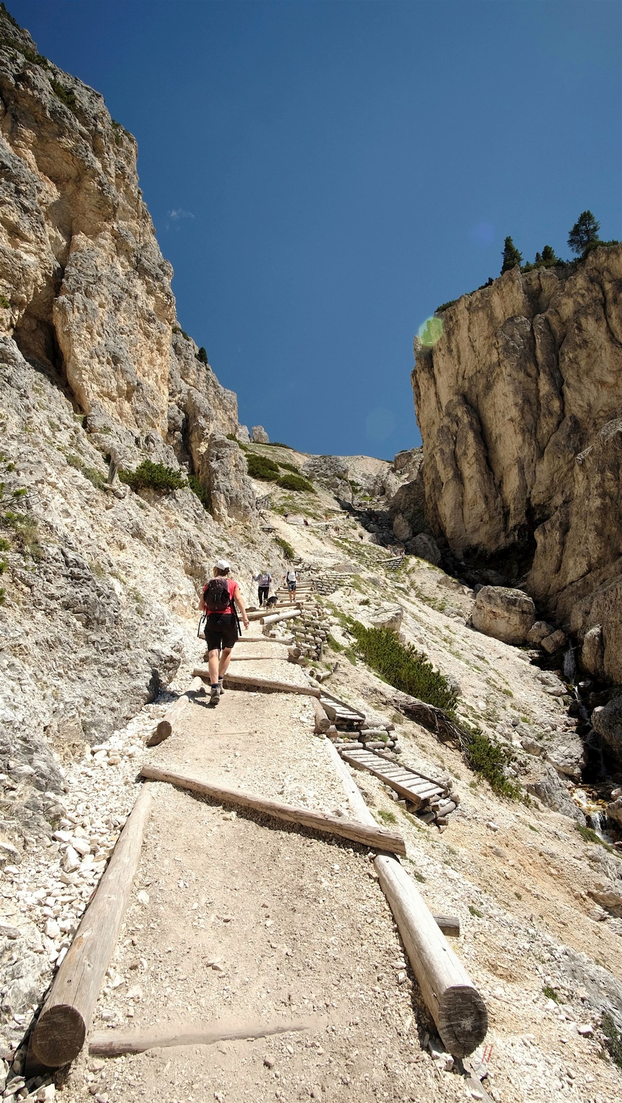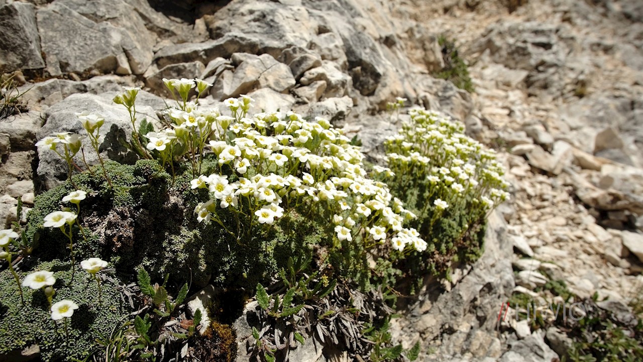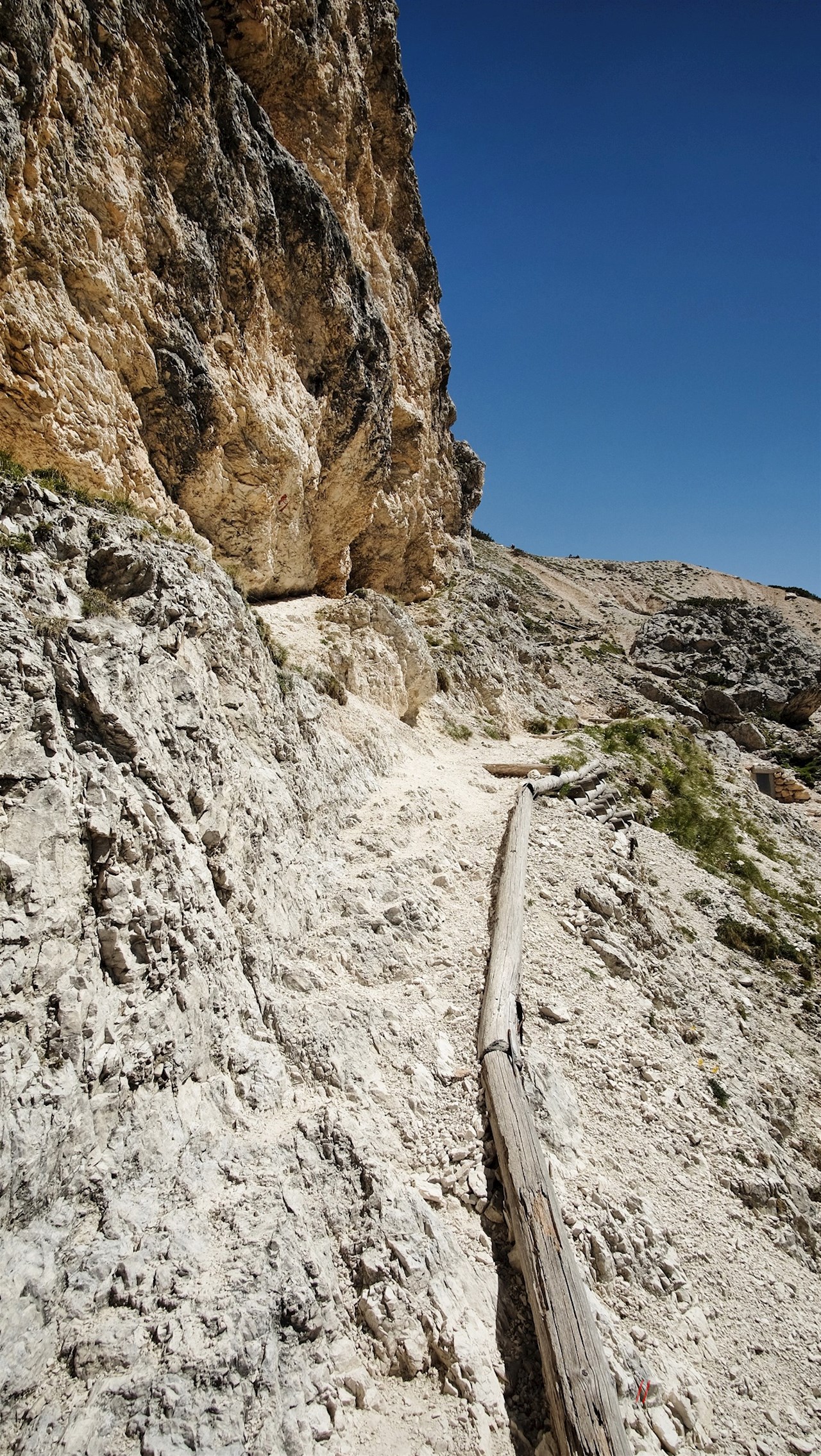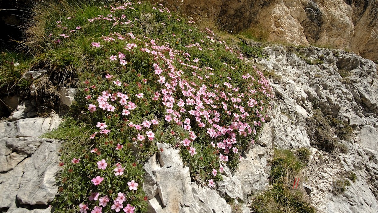 Keeping to marker no. 20, the increasingly narrow path from the rifugio Scotoni moutain hut winds through a rather steep gorge, on whose stony slopes delicate dolomite flowers such as alpine poppy or blue-green saxifrage thrive.