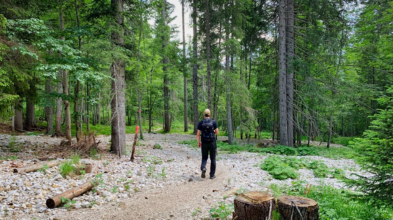 Here the hiking trail no. 1120 branches off to Malga Maraia. It winds its way through flower-filled meadows on a steep climb at the beginning, and a little later enters a mixed forest, soon dominated by beech trees, through which it climbs gently in parts and somewhat more steeply in others.