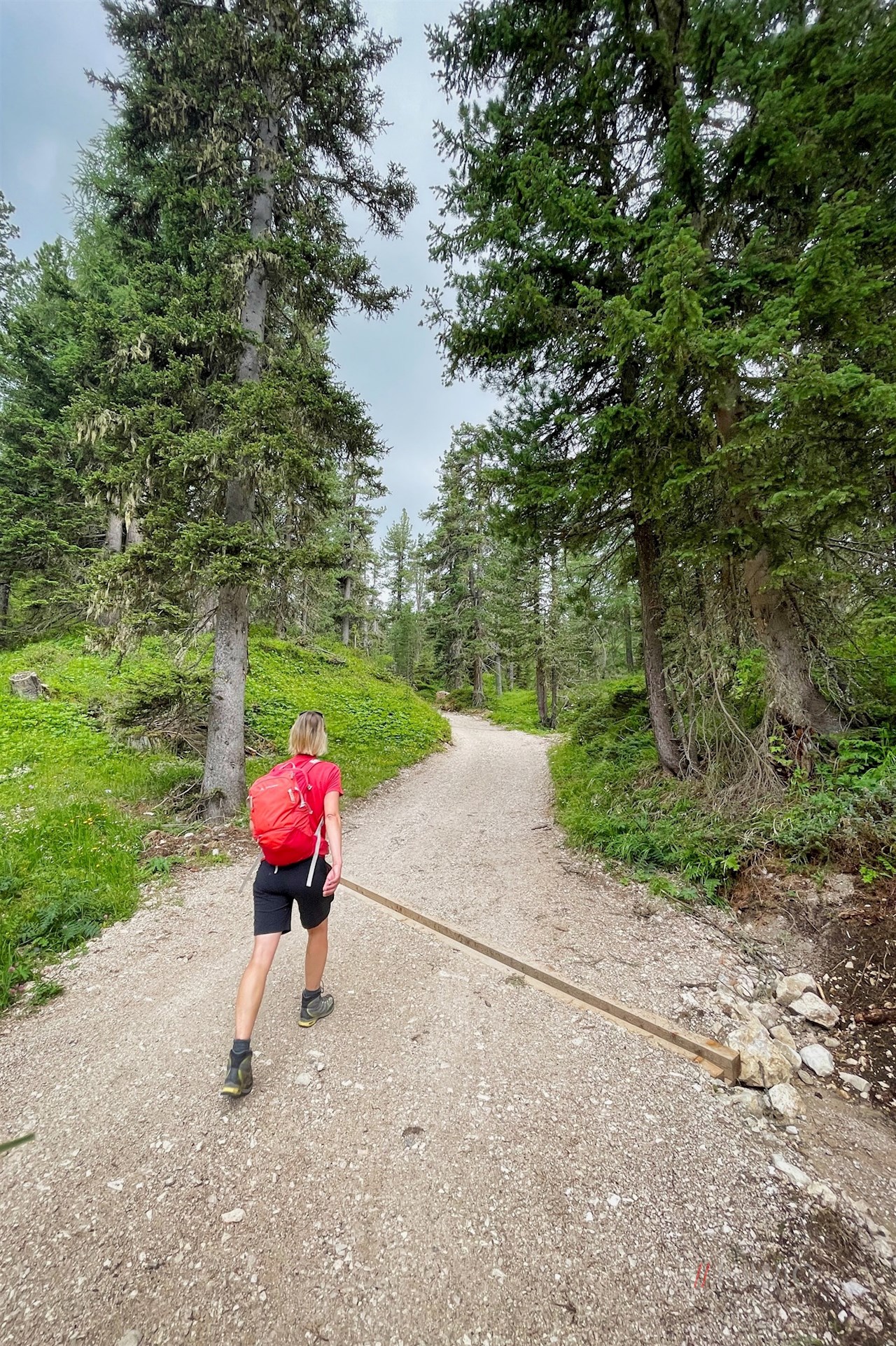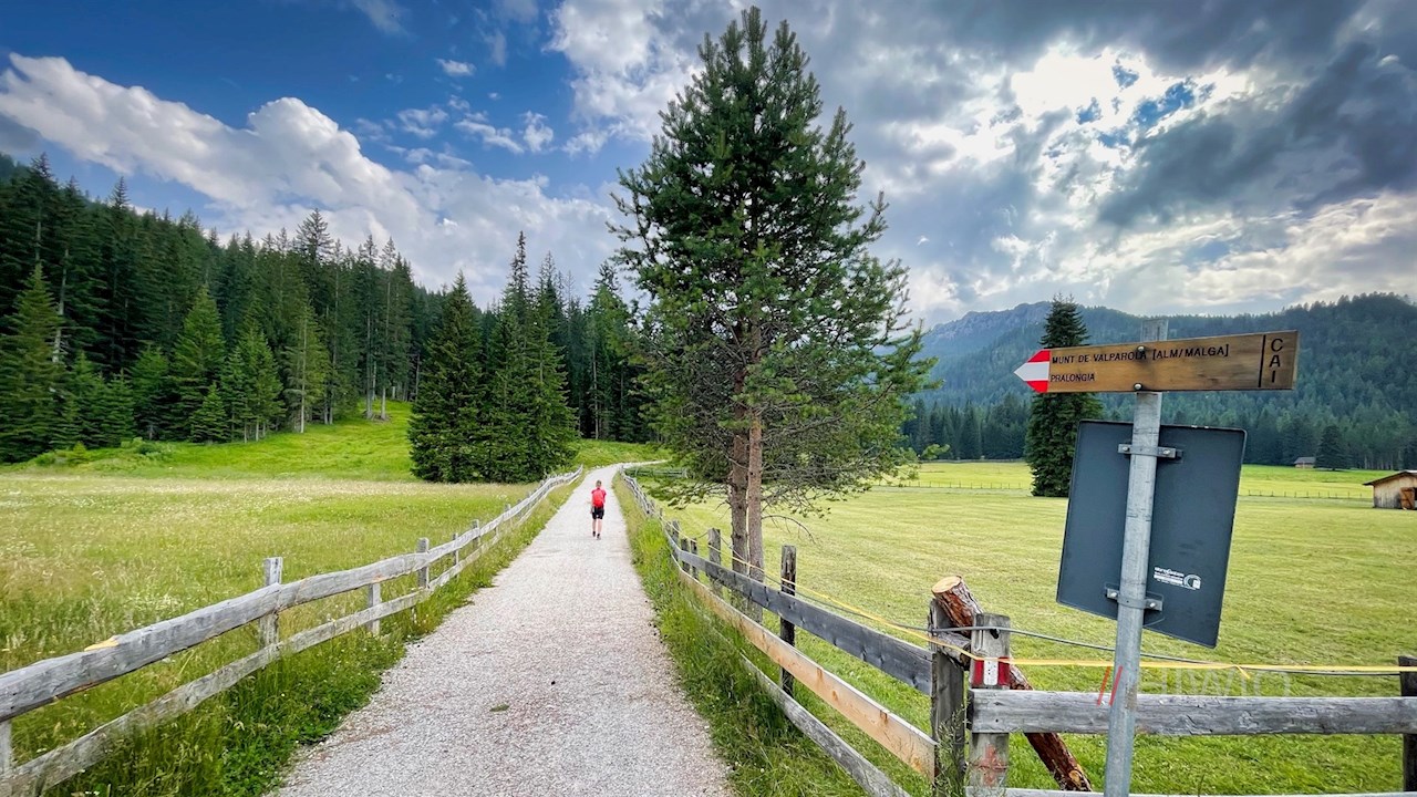 On the opposite side of the road, the wide hiking trail no. 24B branches off in the direction of Pralongia. It leads through meadows with good views and a little later enters a forest.