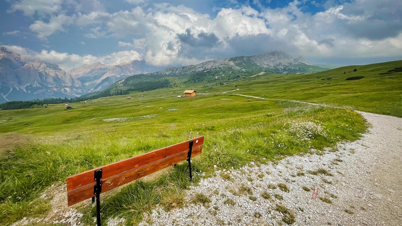 A breathtakingly beautiful panoramic view unfolds on this cross-adorned hill: the view sweeps over famous Dolomites such as the imposing monte Cavallo, the nearby Setsas, the snow-covered Marmolada, the massive Piz Boe or the striking Sassongher all the way to the distant main ridge of the Alps. A lookout bench invites you to linger and enjoy this picturesque view.