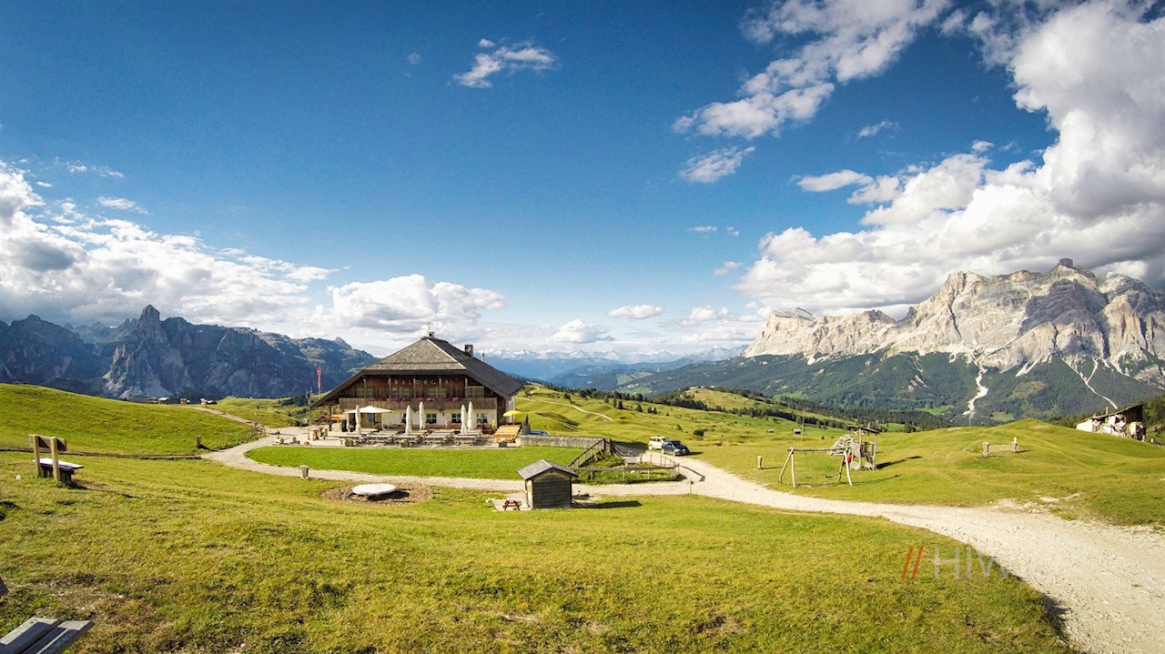 The Pralongia moutain hut, the idyllic flower meadows below the Pralongia plateau and the picturesque view of the Dolomites rising all around make this hike near San Cassiano an unforgettable experience.