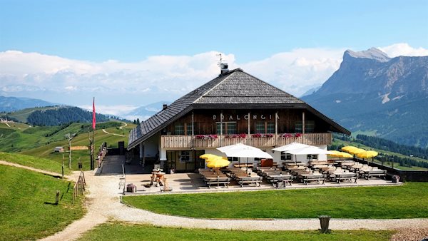 From Störes, trail no. 24 leads down to the nearby Pralongia mountain inn, which is already in sight. In the cozy Zirmstube and on the sun-drenched panoramic terrace, the friendly innkeepers serve their guests tempting culinary delights made from high-quality ingredients to accompany the breathtaking view.