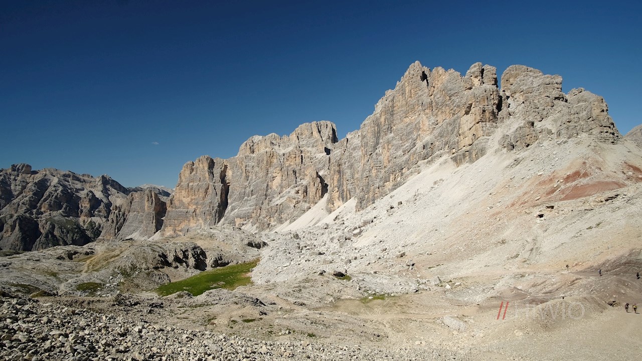 In a leisurely but steady ascent you now walk up through the karst landscape interspersed with grass and alpine flowers to the forcella Lagazuoi at 2,573 m above sea level.