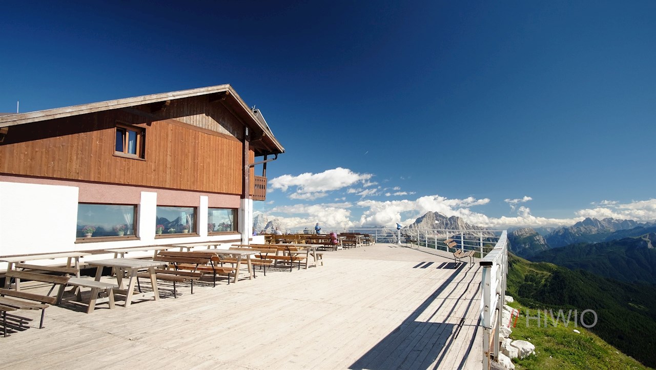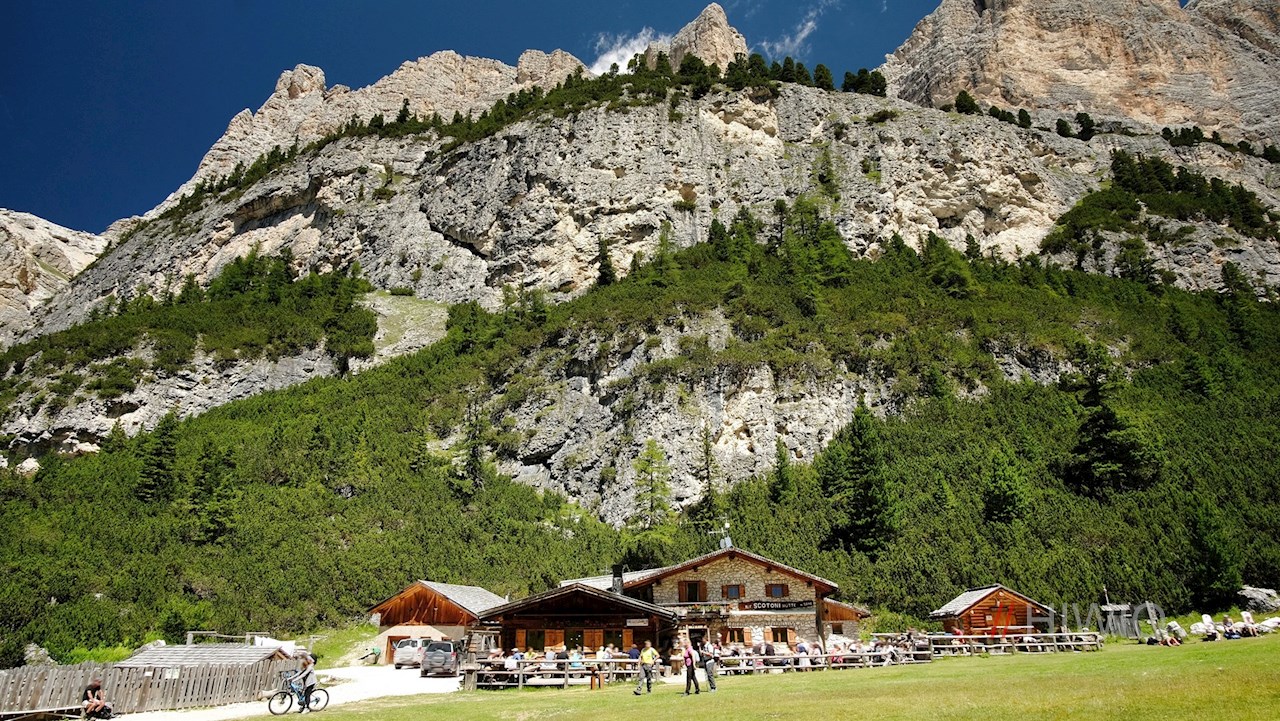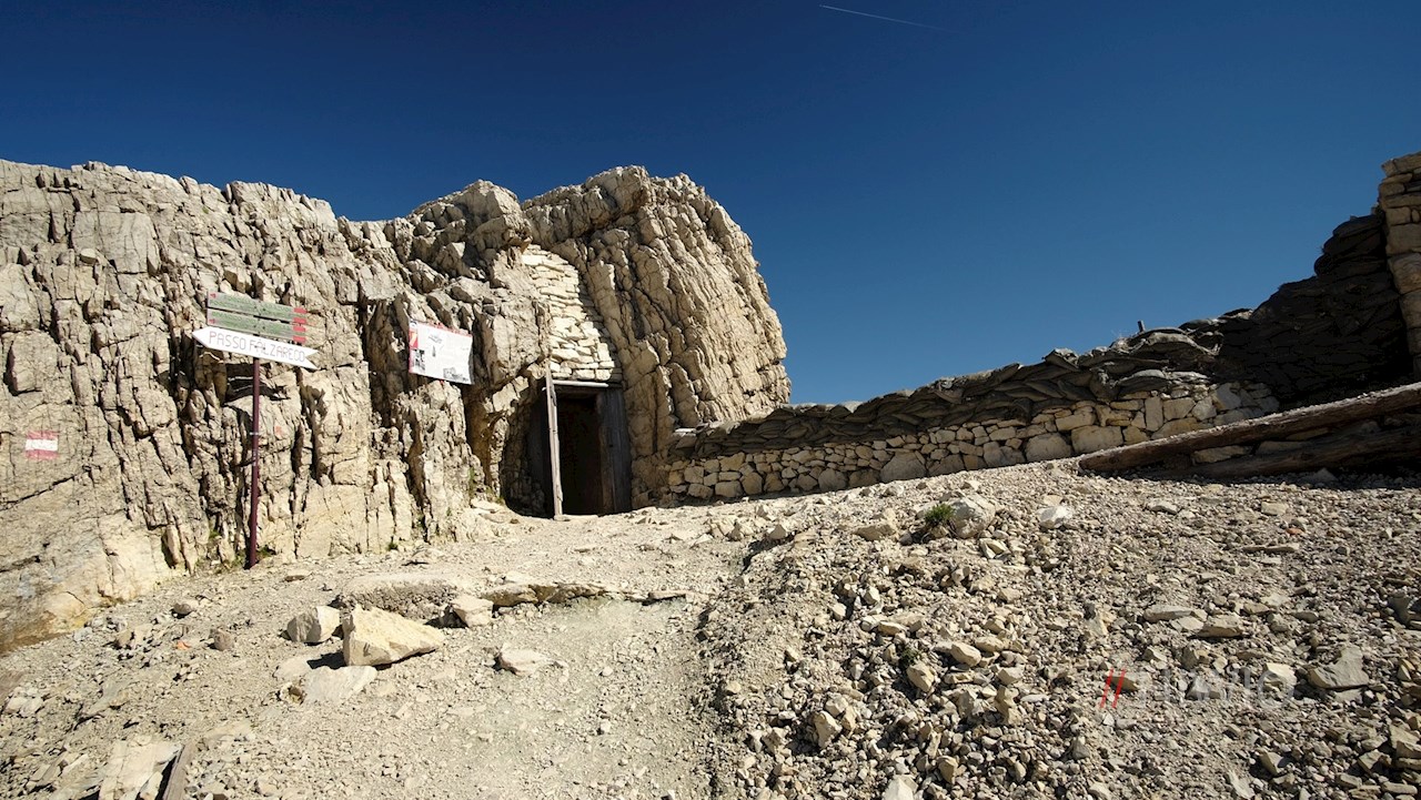 After a total of about an hour you reach this cozy mountain hut surrounded by massive rock walls at 2,040 meters above sea level. The small wooden chapel near it was built in memory of the many soldiers who lost their lives in the first world war.
