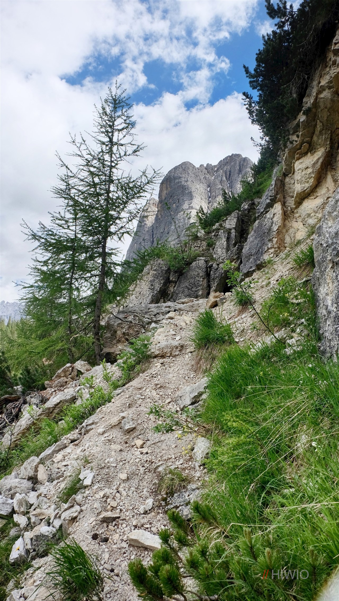 Here you follow hiking trail no. 215 towards the rifugio Vandelli mountain hut or "Rifugio al Sorapis". At first it leads almost flat through a secluded wood, which now and then offers beautiful views of the surrounding bellunese dolomites.